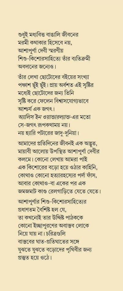 শুধুই মধ্যবিত্ত বাঙালি জীবনের মরমী কথাকার হিসেবে নয়, আশাপূর্ণা দেবী স্মরণীয় শিশু-কিশোরসাহিত্যে তাঁর ব্যতিক্রমী অবদানের জন্যেও।
