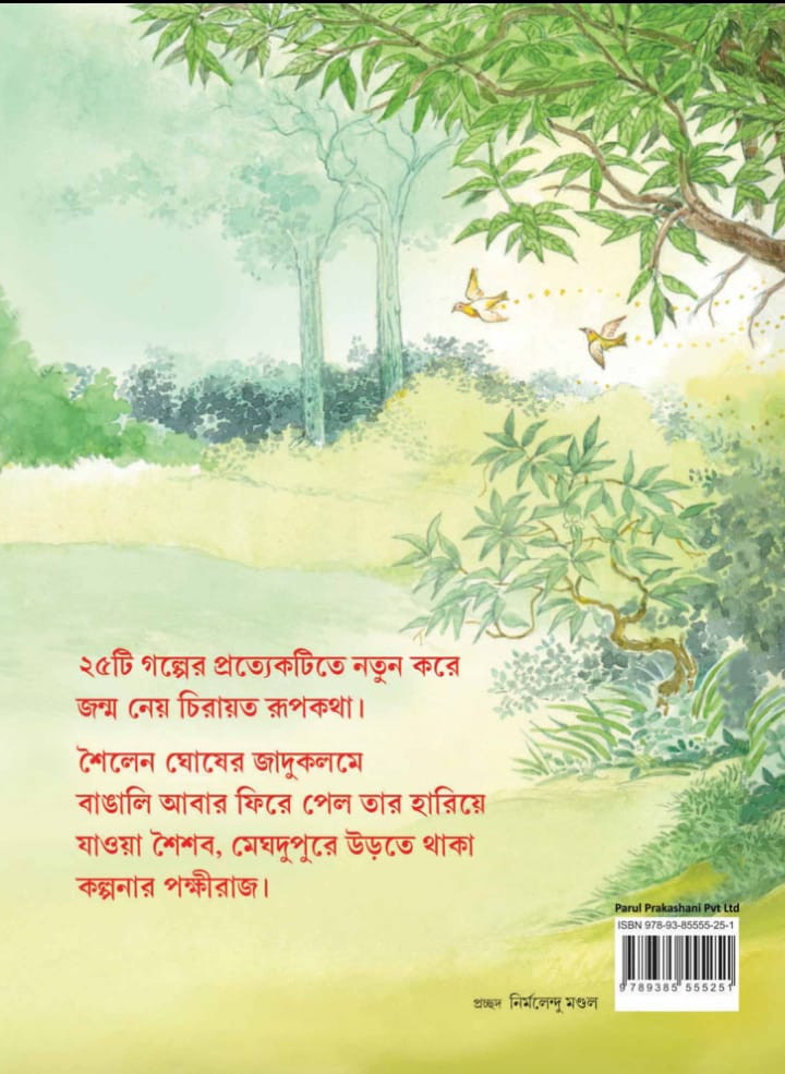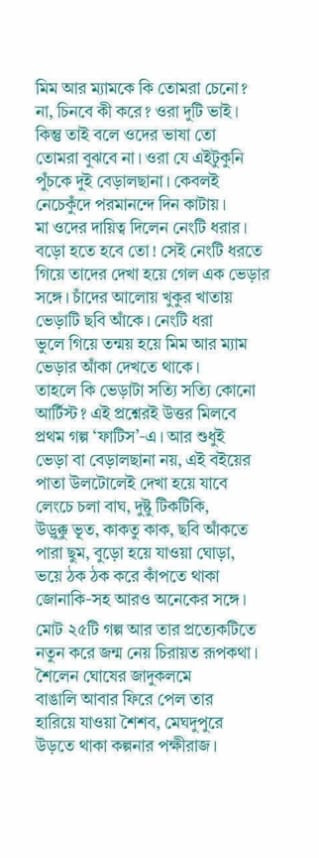 মিম আর ম্যামকে কি তোমরা চেনো? না, চিনবে কী করে? ওরা দুটি ভাই। কিন্তু তাই বলে ওদের ভাষা তো তোমরা বুঝবে না। ওরা যে এইটুকুনি পুঁচকে দুই বেড়ালছানা। কেবলই নেচেকুঁদে পরমানন্দে দিন কাটায়। মা ওদের দায়িত্ব দিলেন নেংটি ধরার। বড়ো হতে হবে তো! সেই নেংটি ধরতে গিয়ে তাদের দেখা হয়ে গেল এক ভেড়ার সঙ্গে। চাঁদের আলোয় খুকুর খাতায় ভেড়াটি ছবি আঁকে। নেংটি ধরা ভুলে গিয়ে তন্ময় হয়ে মিম আর ম্যাম ভেড়ার আঁকা দেখতে থাকে। তাহলে কি ভেড়াটা সত্যি সত্যি কোনো আর্টিস্ট? এই প্রশ্নেরই উত্তর মিলবে প্রথম গল্প 'ফাটিস'-এ। আর শুধুই ভেড়া বা বেড়ালছানা নয়, এই বইয়ের পাতা উলটোলেই দেখা হয়ে যাবে লেংচে চলা বাঘ, দুষ্টু টিকটিকি, উড়ুক্কু ভূত, কাকতু কাক, ছবি আঁকতে পারা ছুম, বুড়ো হয়ে যাওয়া ঘোড়া, ভয়ে ঠক ঠক করে কাঁপতে থাকা জোনাকি-সহ আরও অনেকের সঙ্গে। মোট ২৫টি গল্প আর তার প্রত্যেকটিতে নতুন করে জন্ম নেয় চিরায়ত রূপকথা। শৈলেন ঘোষের জাদুকলমে বাঙালি আবার ফিরে পেল তার হারিয়ে যাওয়া শৈশব, মেঘদুপুরে উড়তে থাকা কল্পনার পক্ষীরাজ।