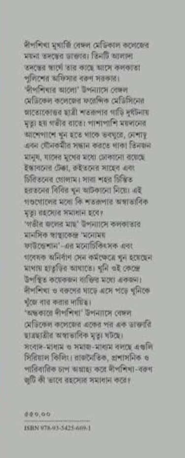 ‘অন্ধকারে দীপশিখা’ উপন্যাসে বেঙ্গল মেডিকেল কলেজের একের পর এক ডাক্তারি ছাত্রছাত্রীর অস্বাভাবিক মৃত্যু ঘটছে। সংবাদ-মাধ্যম ও সমাজ-মাধ্যম বলছে এগুলি সিরিয়াল কিলিং।