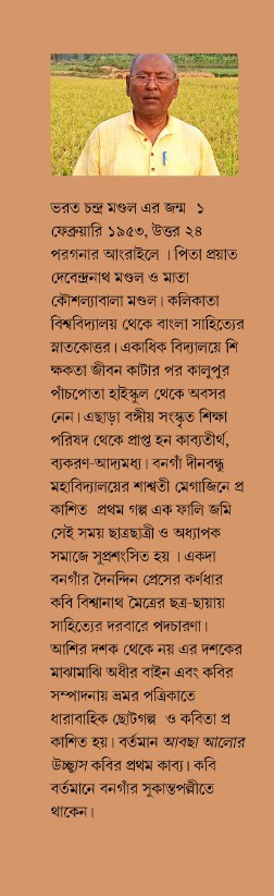 ভরত চন্দ্র মণ্ডল এর জন্ম ১ ফেব্রুয়ারি ১৯৫৩, উত্তর ২৪ পরগনার আংরাইলে। পিতা প্রয়াত দেবেন্দ্রনাথ মণ্ডল ও মাতা কৌশল্যাবালা মণ্ডল। কলিকাতা বিশ্ববিদ্যালয় থেকে বাংলা সাহিত্যের স্নাতকোত্তর। একাধিক বিদ্যালয়ে শিক্ষকতা জীবন কাটার পর কালুপুর পাঁচপোতা হাইস্কুল থেকে অবসর নেন। এছাড়া বঙ্গীয় সংস্কৃত শিক্ষা পরিষদ থেকে প্রাপ্ত হন কাব্যতীর্থ, ব্যকরণ-আদ্যমধ্য। বনগাঁ দীনবন্ধু মহাবিদ্যালয়ের শাশ্বতী মেগাজিনে প্রকাশিত প্রথম গল্প এক ফালি জমি সেই সময় ছাত্রছাত্রী ও অধ্যাপক সমাজে সুপ্রশংসিত হয়। একদা বনগাঁর দৈনন্দিন প্রেসের কর্ণধার কবি বিশ্বানাথ মৈত্রের ছত্র-ছায়ায় সাহিত্যের দরবারে পদচারণা। আশির দশক থেকে নয় এর দশকের মাঝামাঝি অধীর বাইন এবং কবির সম্পাদনায় ভ্রমর পত্রিকাতে ধারাবাহিক ছোটগল্প ও কবিতা প্রকাশিত হয়। বর্তমান 'আবছা আলোর উচ্ছ্বাস' কবির প্রথম কাব্য। কবি বর্তমানে বনগাঁর সুকান্তপল্লীতে থাকেন।