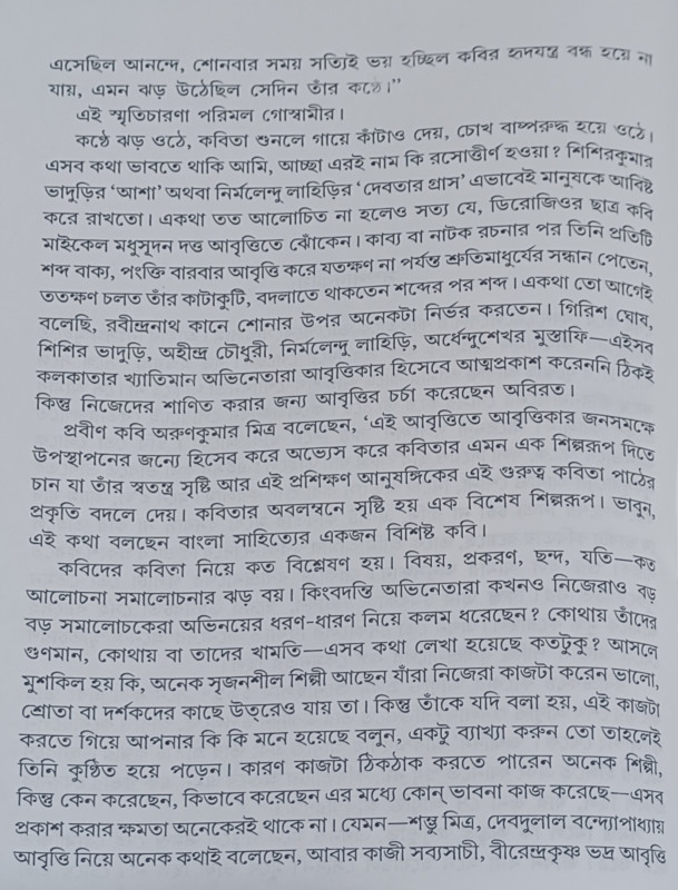 "ভাষানির্ভর বার্তা বিনিময়ের এই সাবলীল চলমানতাকে আশ্রয় করে মুখনিঃসৃত শব্দ প্রক্ষেপণের যথাযথ এবং সৃজনশীল উপস্থাপনার মধ্য দিয়েই বাচিকশিল্পের আত্মপ্রকাশ এবং এগিয়ে চলা। চলার পথে একমাত্র মূলধন কণ্ঠ আর স্বরোৎক্ষেপণের বিভিন্নতা।