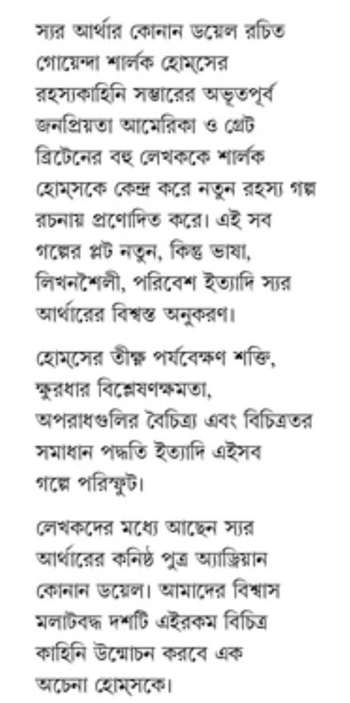 লেখকদের মধ্যে আছেন স্যর আর্থারের কনিষ্ঠ পুত্র অ্যাড্রিয়ান কোনান ডয়েল। আমাদের বিশ্বাস মলাটবদ্ধ দশটি এইরকম বিচিত্র কাহিনি উন্মোচন করবে এক অচেনা হোম্সকে।