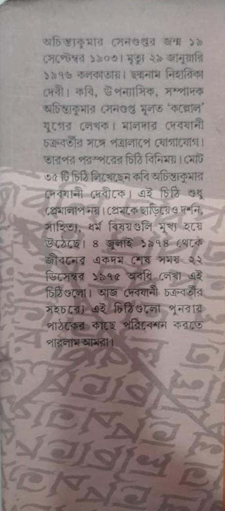 অচিন্ত্যকুমার সেনগুপ্তর জন্ম ১৯ সেপ্টেম্বর ১৯০৩। মৃত্যু ২৯ জানুয়ারি ১৯৭৬ কলকাতায়। ছদ্মনাম নিহারিকা দেবী। কবি, উপন্যাসিক, সম্পাদক অচিন্ত্যকুমার সেনগুপ্ত মূলত 'কল্লোল' যুগের লেখক। মালদার দেবযানী চক্রবর্তীর সঙ্গে পত্রালাপে যোগাযোগ। তারপর পরস্পরের চিঠি বিনিময়। মোট ৩৫ টি চিঠি লিখেছেন কবি অচিন্ত্যকুমার দেবযানী দেবীকে। এই চিঠি শুধু প্রেমালাপ নয়। প্রেমকে ছাড়িয়েও দর্শন, সাহিত্য, ধর্ম বিষয়গুলি মুখ্য হয়ে উঠেছে। ৪ জুলাই ১৯৭৪ থেকে জীবনের একদম শেষ সময় ২২ ডিসেম্বর ১৯৭৫ অবধি লেখা এই চিঠিগুলো। আজ দেবযানী চক্রবর্তীর সহচর্যে এই চিঠিগুলো পুনরায় পাঠকের কাছে পরিবেশন করতে পারলাম আমরা।