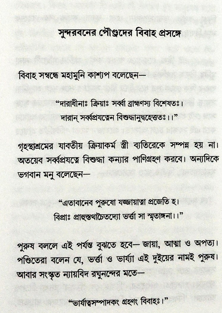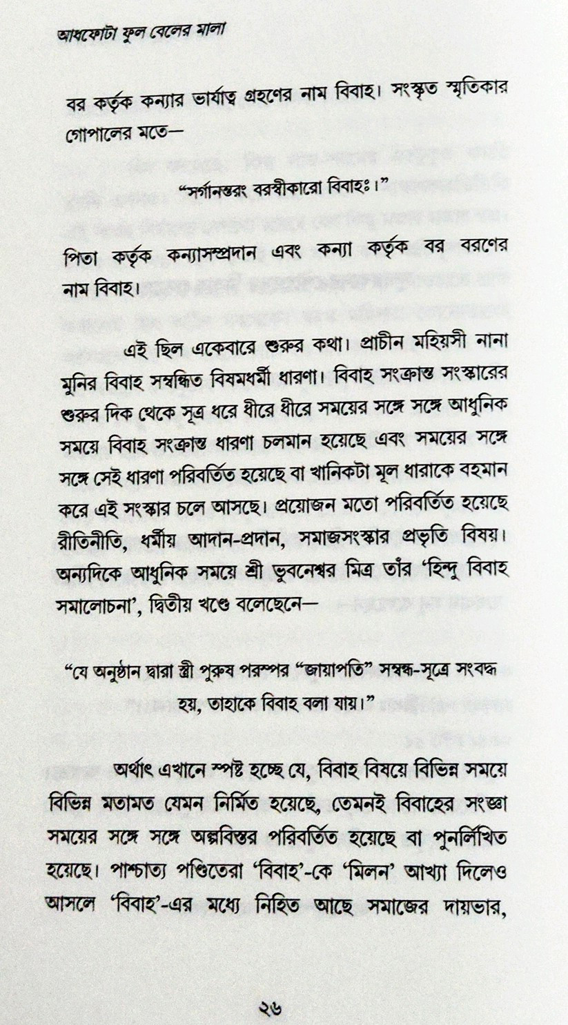 অর্থাৎ এখানে স্পষ্ট হচ্ছে যে, বিবাহ বিষয়ে বিভিন্ন সময়ে বিভিন্ন মতামত যেমন নির্মিত হয়েছে, তেমনই বিবাহের সংজ্ঞা সময়ের সঙ্গে সঙ্গে অল্পবিস্তর পরিবর্তিত হয়েছে বা পুনর্লিখিত হয়েছে। পাশ্চাত্য পণ্ডিতেরা 'বিবাহ'-কে 'মিলন' আখ্যা দিলেও আসলে 'বিবাহ'-এর মধ্যে নিহিত আছে সমাজের দায়ভার,.....