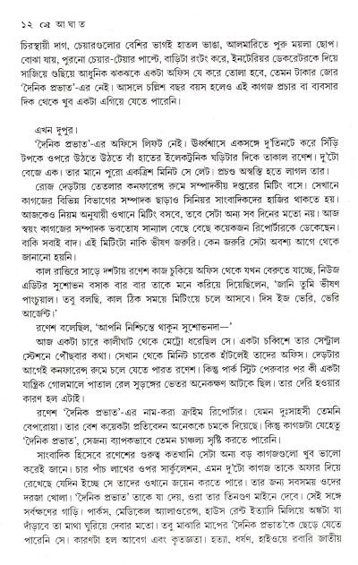 "আজকেও নিয়ম অনুযায়ী ওখানে মিটিং বসবে, তবে সেটা অন্য সব দিনের মতো নয়। আজ স্বয়ং কাগজের সম্পাদক ভবতোষ সান্যাল বেছে বেছে কয়েকজন রিপোর্টারকে ডেকেছেন। বাকি সবাই বাদ। এই মিটিংটা নাকি ভীষণ জরুরি। কেন জরুরি সেটা অবশ্য আগে থেকে জানানো হয়নি।
