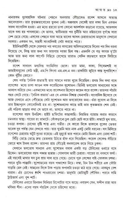 সাংবাদিক হিসেবে রণেশের গুরুত্ব কতখানি সেটা অন্য বড় কাগজগুলো খুব ভালো করেই জানে। চার পাঁচ লাখের ওপর সার্কুলেশন, এমন দু'টো কাগজ তাকে অফার দিয়ে রেখেছে যেদিন ইচ্ছে সে তাদের ওখানে জয়েন করতে পারে। তার জন্য সবসময় ওদের দরজা খোলা। 'দৈনিক প্রভাত' তাকে যা দেয়, ওরা তার তিনগুণ মাইনে দেবে। সেই সঙ্গে সর্বক্ষণের গাড়ি। পার্কস, মেডিকেল অ্যালাওরেন্স, হাউস রেন্ট ইত্যাদি মিলিয়ে অঙ্কটা যা দাঁড়াবে তা মাথা ঘুরিয়ে দেবার মতো। তবু মাঝারি মাপের 'দৈনিক প্রভাত'কে ছেড়ে যেতে পারেনি সে। কারণটা হল আবেগ এবং কৃতজ্ঞতা।..."