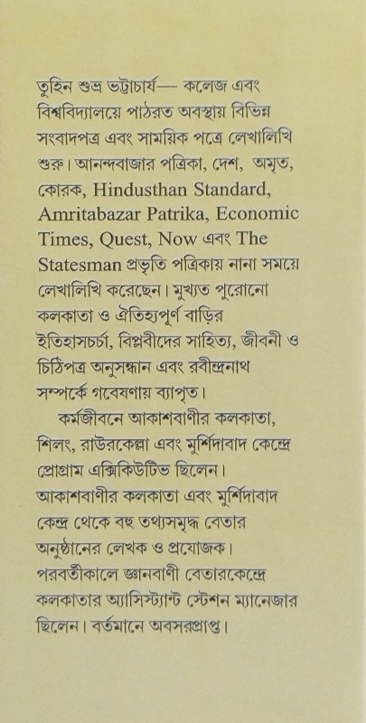 তুহিন শুভ্র ভট্টাচার্য- কলেজ এবং বিশ্ববিদ্যালয়ে পাঠরত অবস্থায় বিভিন্ন সংবাদপত্র এবং সাময়িক পত্রে লেখালিখি শুরু। আনন্দবাজার পত্রিকা, দেশ, অমৃত, কোরক, Hindusthan Standard, Amritabazar Patrika, Economic Times, Quest, Now এবং The Statesman প্রভৃতি পত্রিকায় নানা সময়ে লেখালিখি করেছেন। মুখ্যত পুরোনো কলকাতা ও ঐতিহ্যপূর্ণ বাড়ির ইতিহাসচর্চা, বিপ্লবীদের সাহিত্য, জীবনী ও চিঠিপত্র অনুসন্ধান এবং রবীন্দ্রনাথ সম্পর্কে গবেষণায় ব্যাপৃত।