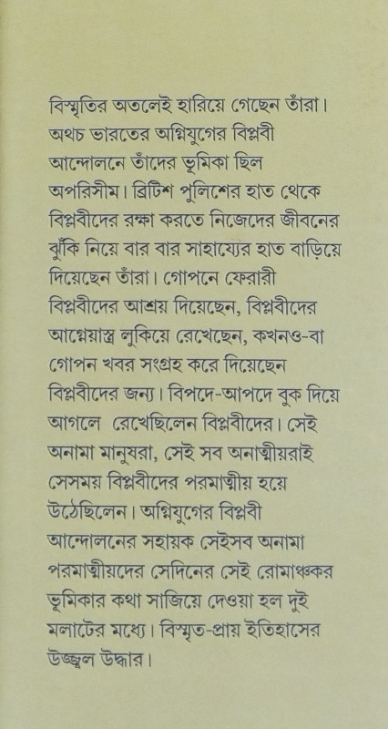 বিস্মৃতির অতলেই হারিয়ে গেছেন তাঁরা। অথচ ভারতের অগ্নিযুগের বিপ্লবী আন্দোলনে তাঁদের ভূমিকা ছিল অপরিসীম। ব্রিটিশ পুলিশের হাত থেকে বিপ্লবীদের রক্ষা করতে নিজেদের জীবনের ঝুঁকি নিয়ে বার বার সাহায্যের হাত বাড়িয়ে দিয়েছেন তাঁরা। গোপনে ফেরারী বিপ্লবীদের আশ্রয় দিয়েছেন, বিপ্লবীদের আগ্নেয়াস্ত্র লুকিয়ে রেখেছেন, কখনও-বা গোপন খবর সংগ্রহ করে দিয়েছেন বিপ্লবীদের জন্য। বিপদে-আপদে বুক দিয়ে আগলে রেখেছিলেন বিপ্লবীদের। সেই অনামা মানুষরা, সেই সব অনাত্মীয়রাই সেসময় বিপ্লবীদের পরমাত্মীয় হয়ে উঠেছিলেন। অগ্নিযুগের বিপ্লবী আন্দোলনের সহায়ক সেইসব অনামা পরমাত্মীয়দের সেদিনের সেই রোমাঞ্চকর ভূমিকার কথা সাজিয়ে দেওয়া হল দুই মলাটের মধ্যে। বিস্মৃত-প্রায় ইতিহাসের উজ্জ্বল উদ্ধার।