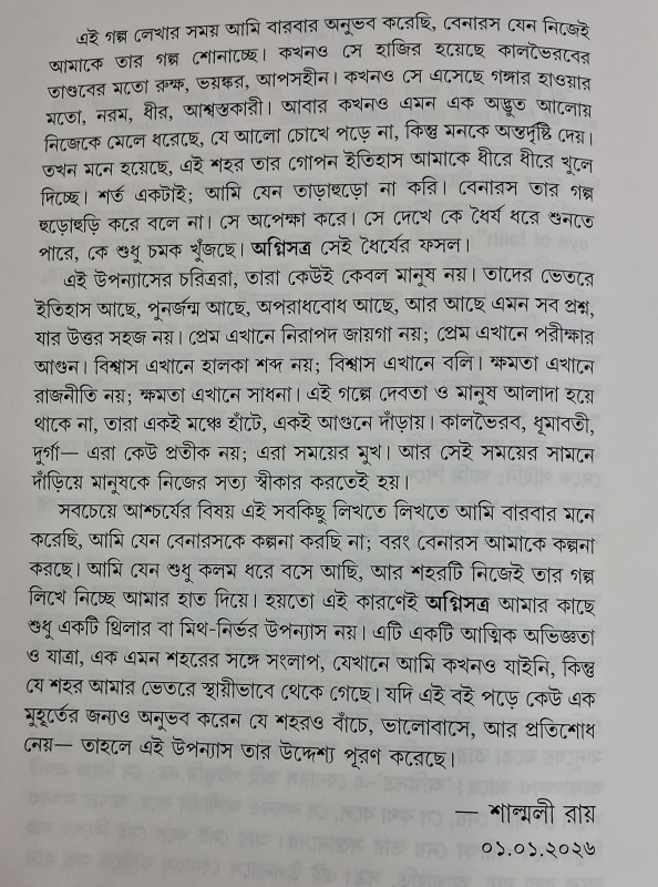 সবচেয়ে আশ্চর্যের বিষয় এই সবকিছু লিখতে লিখতে আমি বারবার মনে করেছি, আমি যেন বেনারসকে কল্পনা করছি না; বরং বেনারস আমাকে কল্পনা করছে। আমি যেন শুধু কলম ধরে বসে আছি, আর শহরটি নিজেই তার গল্প লিখে নিচ্ছে আমার হাত দিয়ে। হয়তো এই কারণেই অগ্নিসত্র আমার কাছে শুধু একটি থ্রিলার বা মিথ-নির্ভর উপন্যাস নয়। এটি একটি আত্মিক অভিজ্ঞতা ও যাত্রা, এক এমন শহরের সঙ্গে সংলাপ, যেখানে আমি কখনও যাইনি, কিন্তু যে শহর আমার ভেতরে স্থায়ীভাবে থেকে গেছে। যদি এই বই পড়ে কেউ এক মুহূর্তের জন্যও অনুভব করেন যে শহরও বাঁচে, ভালোবাসে, আর প্রতিশোধ নেয়- তাহলে এই উপন্যাস তার উদ্দেশ্য পূরণ করেছে।
