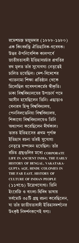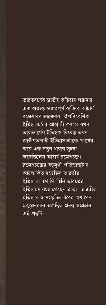 ভারতবর্ষের জাতীয় ইতিহাস ঘরানার এক অত্যন্ত গুরুত্বপূর্ণ ব্যক্তিত্ব আচার্য রমেশচন্দ্র মজুমদার। ঔপনিবেশিক ইতিহাসচর্চার আগ্রাসী কবলে যখন ভারতবর্ষের ইতিহাস বিধ্বস্ত তখন জাতীয়তাবাদী ইতিহাসচর্চাকে পাথেয় করে এক নতুন ধারার সূচনা করেছিলেন আচার্য রমেশচন্দ্র। রমেশচন্দ্রের বহুমুখী প্রতিভাচ্ছটায় আলোকিত হয়েছিল ভারতীয় ইতিহাস। তথাপি তিনি ভারতের ইতিহাসে রয়ে গেছেন ব্রাত্য। ভারতীয় ইতিহাস ও সংস্কৃতির উপর অধ্যাপক মজুমদারের অগ্রন্থিত প্রবন্ধ সমাহার এই গ্রন্থটি।