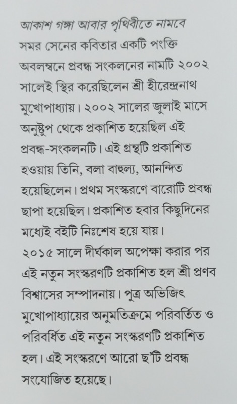 আকাশ গঙ্গা আবার পৃথিবীতে নামবে সমর সেনের কবিতার একটি পংক্তি অবলম্বনে প্রবন্ধ সংকলনের নামটি ২০০২ সালেই স্থির করেছিলেন শ্রী হীরেন্দ্রনাথ মুখোপাধ্যায়। ২০০২ সালের জুলাই মাসে অনুষ্টুপ থেকে প্রকাশিত হয়েছিল এই প্রবন্ধ-সংকলনটি। এই গ্রন্থটি প্রকাশিত হওয়ায় তিনি, বলা বাহুল্য, আনন্দিত হয়েছিলেন। প্রথম সংস্করণে বারোটি প্রবন্ধ ছাপা হয়েছিল। প্রকাশিত হবার কিছুদিনের মধ্যেই বইটি নিঃশেষ হয়ে যায়।