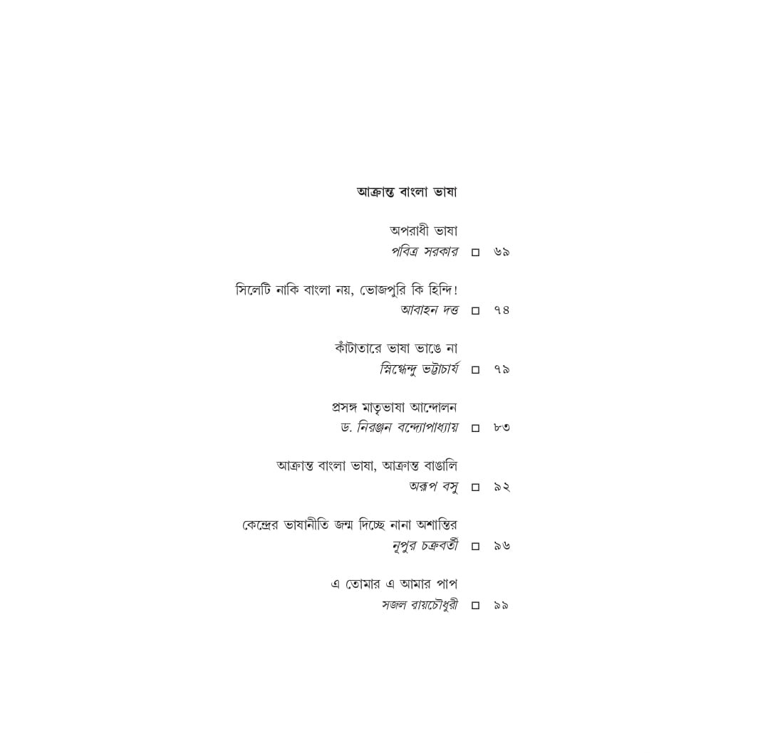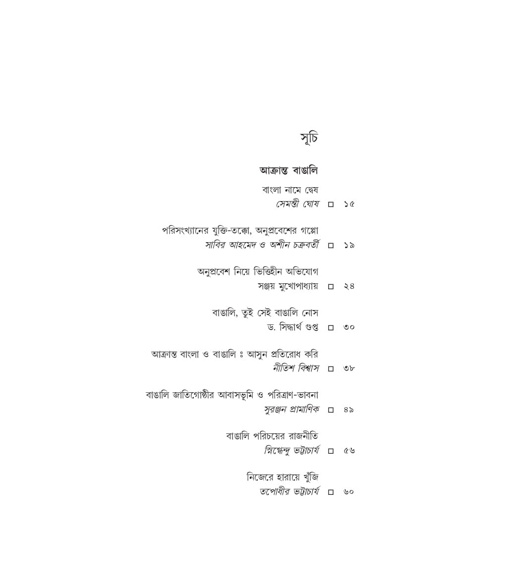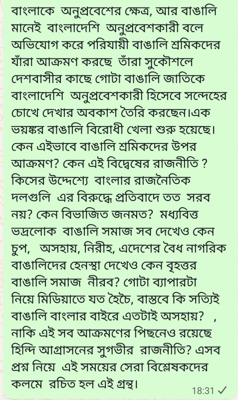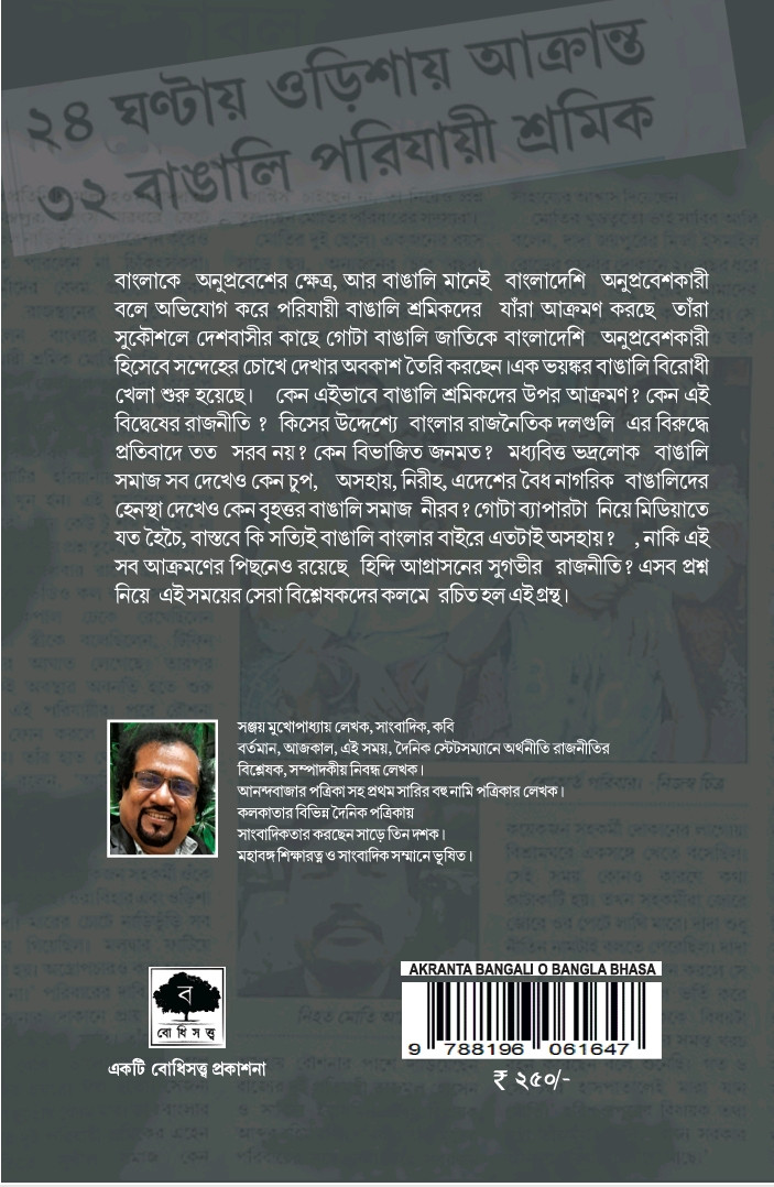 বাংলাকে অনুপ্রবেশের ক্ষেত্র, আর বাঙালি মানেই বাংলাদেশি অনুপ্রবেশকারী বলে অভিযোগ করে পরিযায়ী বাঙালি শ্রমিকদের যাঁরা আক্রমণ করছে তাঁরা সুকৌশলে দেশবাসীর কাছে গোটা বাঙালি জাতিকে বাংলাদেশি অনুপ্রবেশকারী হিসেবে সন্দেহের চোখে দেখার অবকাশ তৈরি করছেন।এক ভয়ঙ্কর বাঙালি বিরোধী খেলা শুরু হয়েছে। কেন এইভাবে বাঙালি শ্রমিকদের উপর আক্রমণ? কেন এই বিদ্বেষের রাজনীতি ? কিসের উদ্দেশ্যে বাংলার রাজনৈতিক দলগুলি এর বিরুদ্ধে প্রতিবাদে তত সরব নয়? কেন বিভাজিত জনমত? মধ্যবিত্ত ভদ্রলোক বাঙালি সমাজ সব দেখেও কেন চুপ, অসহায়, নিরীহ, এদেশের বৈধ নাগরিক বাঙালিদের হেনস্থা দেখেও কেন বৃহত্তর বাঙালি সমাজ নীরব? গোটা ব্যাপারটা নিয়ে মিডিয়াতে যত হৈচৈ, বাস্তবে কি সত্যিই বাঙালি বাংলার বাইরে এতটাই অসহায়? , নাকি এই সব আক্রমণের পিছনেও রয়েছে হিন্দি আগ্রাসনের সুগভীর রাজনীতি? এসব প্রশ্ন নিয়ে এই সময়ের সেরা বিশ্লেষকদের কলমে রচিত হল এই গ্রন্থ।