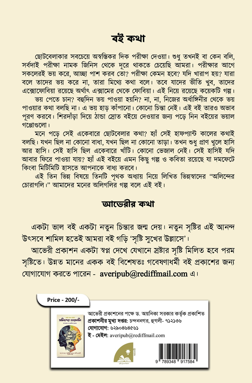 এই তিন ভিন্ন বিষয়ে তিনটি পৃথক অধ্যায় নিয়ে লিখিত ভিন্নস্বাদের "অলিন্দের চোরাগলি।" আমাদের মনের অলিগলির গল্প বলে এই বই।