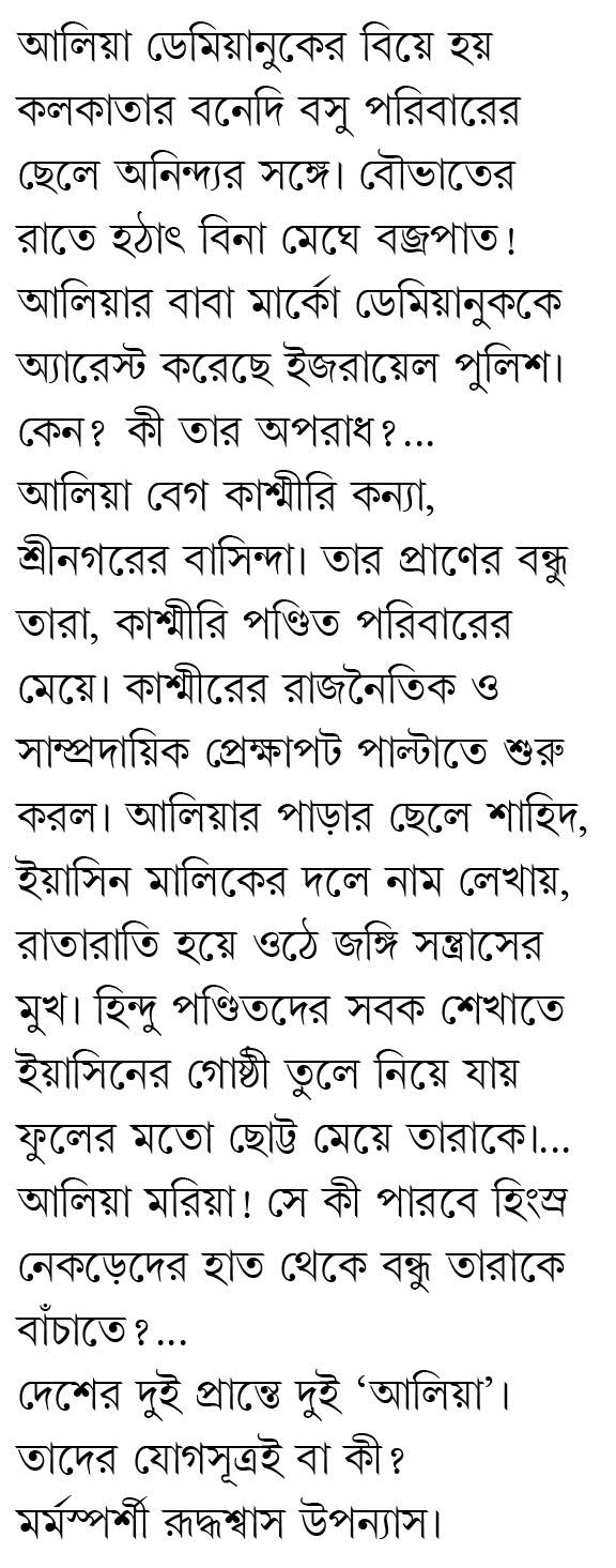 দেশের দুই প্রান্তে দুই 'আলিয়া'। তাদের যোগসূত্রই বা কী? মর্মস্পর্শী রূদ্ধশ্বাস উপন্যাস।