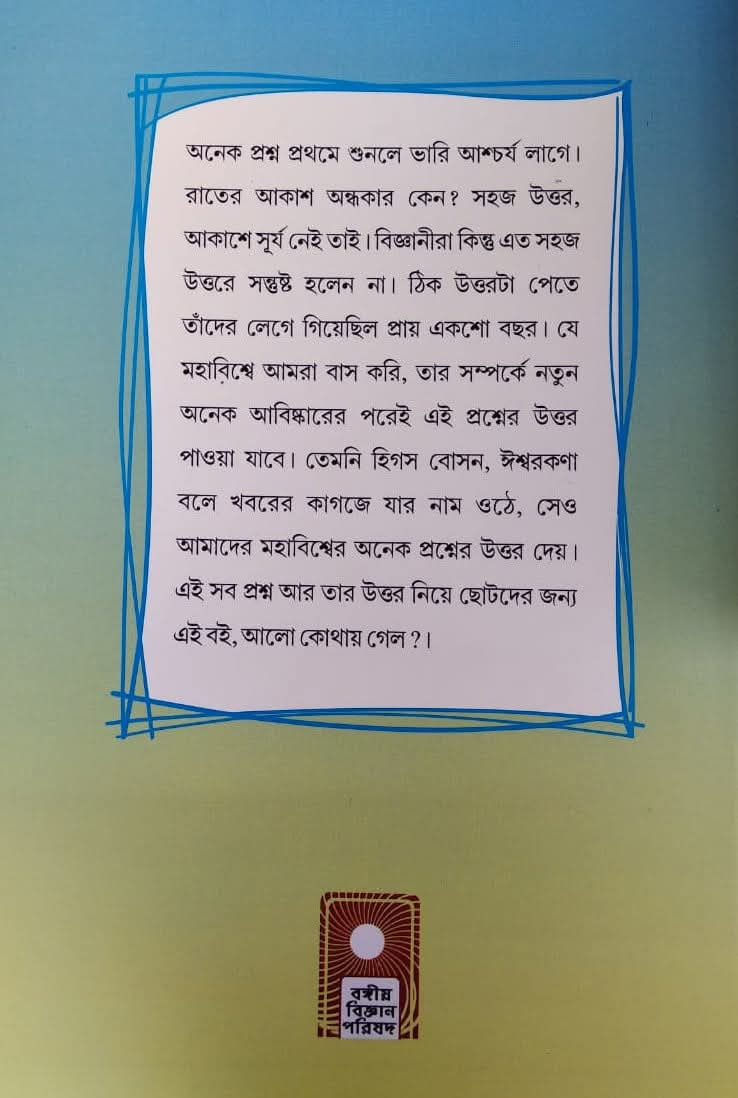 অনেক প্রশ্ন প্রথমে শুনলে ভারি আশ্চর্য লাগে। রাতের আকাশ অন্ধকার কেন? সহজ উত্তর, আকাশে সূর্য নেই তাই। বিজ্ঞানীরা কিন্তু এত সহজ উত্তরে সন্তুষ্ট হলেন না। ঠিক উত্তরটা পেতে তাঁদের লেগে গিয়েছিল প্রায় একশো বছর। যে মহাবিশ্বে আমরা বাস করি, তার সম্পর্কে নতুন অনেক আবিষ্কারের পরেই এই প্রশ্নের উত্তর পাওয়া যাবে। তেমনি হিগস বোসন, ঈশ্বরকণা বলে খবরের কাগজে যার নাম ওঠে, সেও আমাদের মহাবিশ্বের অনেক প্রশ্নের উত্তর দেয়। এই সব প্রশ্ন আর তার উত্তর নিয়ে ছোটদের জন্য এই বই, আলো কোথায় গেল?।