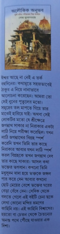 ঈশ্বর আছে না নেই এ তর্ক বহুদিনের। কথামৃতে সহজভাবেই ঠাকুর এ নিয়ে নানাভাবে আলোচনা করেছেন। আমরা তো সেই নুনের পুতুলের মতো। সমুদ্রের তল মাপতে গিয়ে তার মাঝেই হারিয়ে যাই। অথবা সেই লোকটির মতো যে শ্রীক্ষেত্রে জগন্নাথ সাকার না নিরাকার একটা লাঠি নিয়ে পরীক্ষা করেছিল। যখন লাঠি জগন্নাথের বিগ্রহ স্পর্শ করেনি তখন তিনি তার কাছে নিরাকার আবার যখন লাঠি স্পর্শ করল বিগ্রহকে তখন জগন্নাথ দেব তার কাছে সাকার। আসল কথা ভক্তের ভগবান। কখনো তিনি মধুসূদন দাদা হয়ে ভক্তকে জঙ্গল পার করে দেন আবার কখনো ছোট মেয়ের বেশে ভক্তের ঘরের বেড়া বেঁধে দেন। সেদিক থেকে বলতে গেলে এই বইটি চেনা ছকে লেখা কোনো মন্দির ভ্রমণের কাহিনি নয়। এই কাহিনি বিশ্বাসের। হয়তো বা চেতন থেকে চৈতন্যের অনন্ত পথে পৌঁছে যাওয়ার এক দিশা।