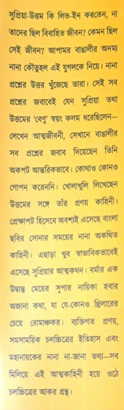 সুপ্রিয়া-উত্তম কি লিভ-ইন করতেন, না তাদের ছিল বিবাহিত জীবন? কেমন ছিল সেই জীবন? আপামর বাঙালীর অদম্য নানা কৌতুহল এই যুগলকে নিয়ে। নানা প্রশ্নের উত্তর খুঁজেছে তারা। সেই সব প্রশ্নের জবাবেই যেন সুপ্রিয়া তথা উত্তমের 'বেণু' স্বয়ং কলম ধরেছিলেন- লেখেন আত্মজীবনী, সেখানে বাঙালীর সব প্রশ্নের জবাব দিয়েছেন তিনি অকপট আন্তরিকভাবে। কোথাও কোনও গোপন করেননি। খোলাখুলি লিখেছেন উত্তমের সঙ্গে তাঁর প্রণয় কাহিনী। প্রেক্ষাপট হিসেবে অবশ্যই এসেছে বাংলা ছবির সোনার সময়ের নানা অকথিত কাহিনী। এছাড়া খুব স্বাভাবিকভাবেই এসেছে সুপ্রিয়ার আত্মকথন। বর্মার এক উদ্বাস্তু মেয়ের সুপার নায়িকা হবার অজানা কথা, যা যে-কোনও থ্রিলারের চেয়ে রোমাঞ্চকর।