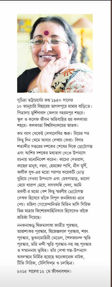 বিশ্বায়িত এই পৃথিবীতে উত্তরাধুনিক বাঙালি মধ্যবিত্ত জীবনের বিশ্বস্ত ভাষ্যকার হিসেবে যাঁর কথাসাহিত্য সব বয়সি পাঠকের মন অবলীলায় জয় করেছে, তিনি সুচিত্রা ভট্টাচার্য। শহুরে মধ্যবিত্ত পরিবারগুলিতে ব্যক্তিগত সম্পর্কের ক্লেদ, টানাপোড়েন, ভঙ্গুর দাম্পত্য, নৈতিক স্খলন, মেয়েদের দুঃখ-কষ্ট, জীবন-যন্ত্রণা যেভাবে তাঁর লেখায় এসেছে, তার তুলনীয় সৃজন সমসাময়িক বাংলা সাহিত্যে অনুপস্থিত। শুধুই জনপ্রিয় কথাসাহিত্যের অভিধায় তাঁর লেখালেখিকে চিহ্নিত করলে তা সুচিত্রা ভট্টাচার্যের ক্ষুরধার কলমের অবমূল্যায়ন হবে।