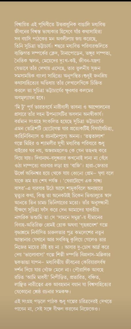 'মি টু' পূর্ব ভারতবর্ষে নারীবাদী ভাবনা ও আন্দোলনের প্রসারে তাঁর দহন উপন্যাসটির অবদান অনস্বীকার্য। বর্তমান সংগ্রহে সংকলিত হয়েছে সুচিত্রা ভট্টাচার্যের এমন তেত্রিশটি ছোটোগল্প যার প্রত্যেকটিই বিষয়বৈচিত্র্য, কাহিনিবিন্যাস ও রচনানৈপুণ্যে অনন্য। 'তত্ত্বতালাশ' গল্পে মিহির ও শ্যামলীর সুখী মধ্যবিত্ত পরিবারে শুধু বাইরের ঘর নয়, অন্তরমহলেও কে যেন তছনছ করে দিয়ে যায়। দিবানাথ-বসুন্ধরার কখনোই দানা না বেঁধে ওঠা দাম্পত্যে বারবার লড়া হয় 'বাজি'। হারা-জেতার ঊর্ধ্বে অবিনশ্বর হয়ে থেকে যায় কোনো প্রেম- ঘৃণা বলে যাকে ভ্রম হয় শেষ পর্যন্ত। 'ঘেরাটোপে এক সান্ধ্য বাসর'-এ বারবার উঠে আসে শামুকবিলে অনাহারে মৃত্যুর কথা, কিন্তু তা অনেকটাই চিকেন ভিন্ডালুতে স্বাদ আনতে তিন চামচ ভিনিগারের মতো। তাঁর অনুসন্ধানী বীক্ষণে সুচিত্রা ফাঁস করে দেন আমাদের যাবতীয় নাগরিক ভণ্ডামি তা সে 'সামনে সমুদ্র'-য় ধীমানের বিবাহ-অতিরিক্ত প্রেমই হোক অথবা 'গৃহপ্রবেশ' গল্পে বৃদ্ধাশ্রমে নির্বাসিত চারুলতার পুত্র কমলেশের নতুন আস্তানার যেখানে আর সবকিছু কুলিয়ে গেলেও তার নিজের মায়ের ঠাঁই হয় না। আবার দু-চোখ আর্দ্র করে দেয় 'ভালোবাসা' গল্পে শিল্পী দম্পতি বিপ্রদাস-মল্লিকার ছকভাঙা যাপন- মধ্যবিত্তীয় জীবনের কেরিয়ারসর্বস্ব দর্শন দিয়ে যার খোঁজ মেলে না। পৌরাণিক আবহে রচিত 'আমি মাধবী' নিপীড়িত, প্রতারিত, বঞ্চিত, লাঞ্ছিত নারীত্বের এক আবহমান বয়ান যা বিশ্বসাহিত্যের যেকোনো শ্রেষ্ঠ রচনার সমকক্ষ।