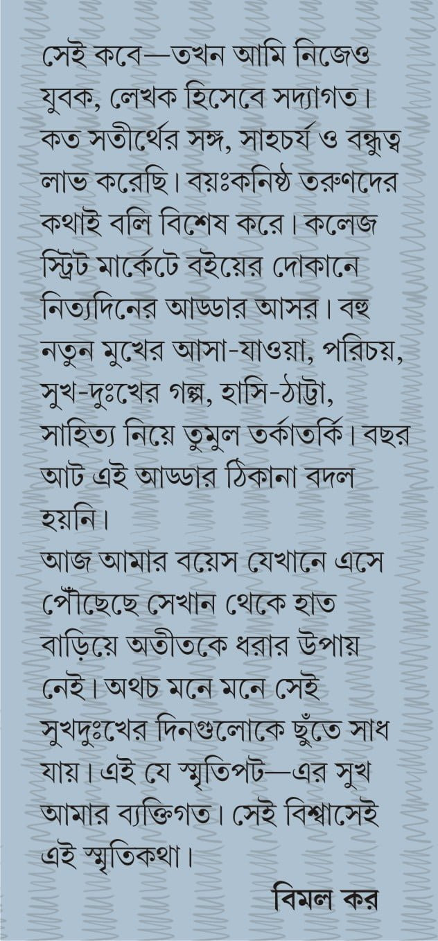 সেই কবে—তখন আমি নিজেও যুবক, লেখক হিসেবে সদ্যাগত ৷ কত সতীর্থের সঙ্গ, সাহচর্য ও বন্ধুত্ব লাভ করেছি ৷ বয়ঃকনিষ্ঠ তরুণদের কথাই বলি বিশেষ করে৷ কলেজ স্ট্রিট মার্কেটে বইয়ের দোকানে নিত্যদিনের আড্ডার আসর ৷ বহু নতুন মুখের আসা-যাওয়া, পরিচয়, সুখ-দুঃখের গল্প, হাসি-ঠাট্টা, সাহিত্য নিয়ে তুমুল তর্কাতর্কি ৷ বছর আট এই আড্ডার ঠিকানা বদল হয়নি ৷