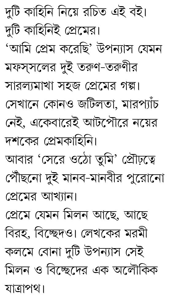 দুটি কাহিনি নিয়ে রচিত এই বই। দুটি কাহিনিই প্রেমের। ‘আমি প্রেম করেছি’ উপন্যাস যেমন মফস্সলের দুই তরুণ-তরুণীর সারল্যমাখা সহজ প্রেমের গল্প। সেখানে কোনও জটিলতা, মারপ্যাঁচ নেই, একেবারেই আটপৌরে নয়ের দশকের প্রেমকাহিনি। আবার ‘সেরে ওঠো তুমি’ প্রৌঢ়ত্বে পৌঁছনো দুই মানব-মানবীর পুরোনো প্রেমের আখ্যান। প্রেমে যেমন মিলন আছে, আছে বিরহ, বিচ্ছেদও। লেখকের মরমী কলমে বোনা দুটি উপন্যাস সেই মিলন ও বিচ্ছেদের এক মধুময় যাত্রাপথ।