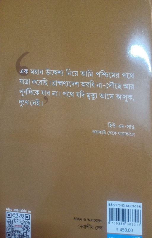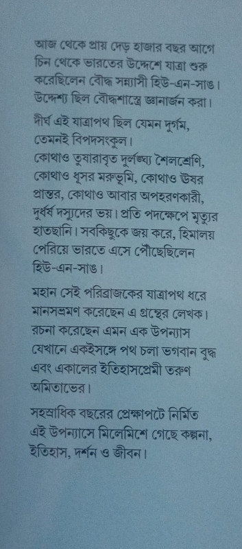 আজ থেকে প্রায় দেড় হাজার বছর আগে চিন থেকে ভারতের উদ্দেশে যাত্রা শুরু করেছিলেন বৌদ্ধ সন্ন্যাসী হিউ-এন-সাঙ। উদ্দেশ্য ছিল বৌদ্ধশাস্ত্রে জ্ঞানার্জন করা। মহান সেই পরিব্রাজকের যাত্রাপথ ধরে মানসভ্রমণ করেছেন এ গ্রন্থের লেখক। রচনা করেছেন এমন এক উপন্যাস যেখানে একইসঙ্গে পথ চলা ভগবান বুদ্ধ এবং একালের ইতিহাসপ্রেমী তরুণ অমিতাভের।