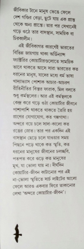 এই জীবিকাগত কারণেই ভারতের বিভিন্ন জায়গায় থাকা অর্ডিন্যান্স ফ্যাক্টরির কোয়ার্টারগুলোতে সাময়িক ভাবে থাকতে আসে সারা ভারতের কত ধরনের মানুষ, যাদের মধ্যে ধর্ম ভাষা খাদ্যাভ্যাস পোশাক আচার-আচরণ রীতিনীতির বিস্তর ফারাক, মিল বলতে শুধু কর্মস্থলের। আর এই কর্মস্থলকে কেন্দ্র করে গড়ে ওঠা কোয়ার্টার জীবনে পাশাপাশি থাকতে থাকতে তৈরি হয় প্রাণের যোগাযোগ, কত গল্পগাথা। অন্দরে বয়ে চলে সাদা-কালো কত রঙের স্রোত। তার পর একদিন এই বাসস্থান ছেড়ে চলে যাওয়ার সময় পিছনে পড়ে থাকে কত স্মৃতি, কত ধরনের মানুষের জীবনের চলচ্ছবি, পতপত করে ওড়ে কত মানুষের মুখ, যা ভোলা যায় না। দীর্ঘদিন কোয়ার্টার-জীবন কাটানোর পর এই না-ভোলা স্মৃতিতে সার্চ লাইটের আলো ফেলে আরও একবার ফিরে তাকানোর লেখা 'অন্দরে কোয়ার্টার-জীবন'।