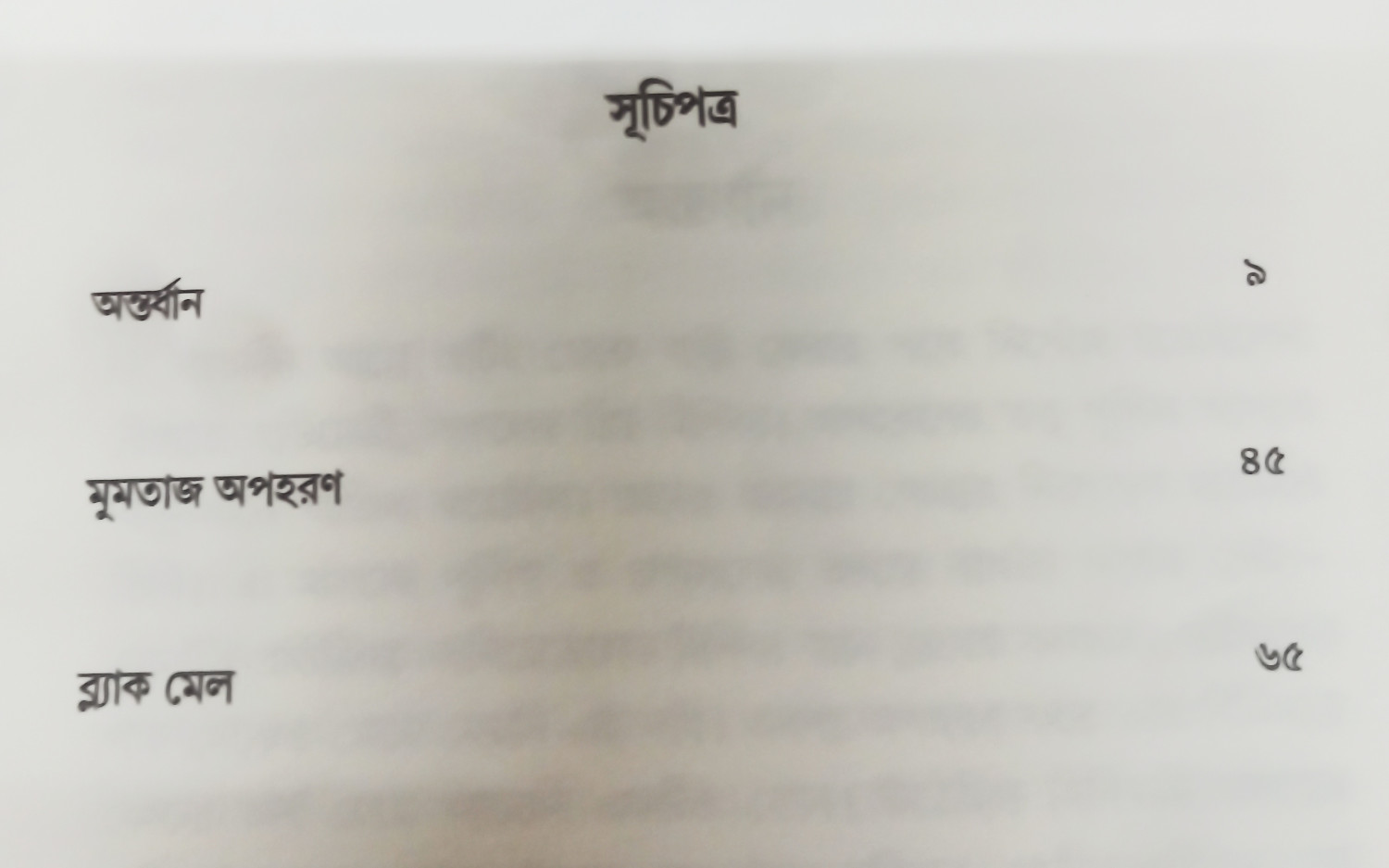 তিনটি রহস্য কাহিনি নিয়ে এই গ্রন্থ। তিনটিরই মুখ্য চরিত্র নারী। ৩০-৩২ বছরের পুরস্কার প্রাপ্ত নায়িকা হঠাৎ বাড়ি ফেরার পথে নিরুদ্দেশ হয়ে যায়। কোথায় গেল সে? কেন গেল? তাকে কী পাওয়া গেল অক্ষত অবস্থায়! এর পিছনে কে বা কারা লুকিয়ে সেই নিয়ে প্রথম কাহিনি। দ্বিতীয় কাহিনির প্রেক্ষাপট ব্রিটিশ অধুষ্যিত বম্বে।ব্যস্ত রাস্তায় এক নারীকে অপহরণের ও খুনের চেষ্টা করা হয়।কে বা কারা জড়িত এর সঙ্গে তা জানতে তদন্তে নামে ব্রিটিশ পুলিস। উঠে আসে এক চাঞ্চল্যকর ষড়যন্ত্রের কাহিনি। প্রতিষ্ঠিত প্রকাশক মোহিনী চৌধুরীর ১৮ বছরের মেয়ে ও তার বন্ধুকে ইনস্টাতে ক্রমাগত নোংরা মেসেজ ও গালাগাল ও খুনের হুমকি দেয় একটি ছেলে।তার বয়সও ওই কুড়ি বাইশ। তদন্তে নামে সাইবার ক্রাইম বিভাগ।কে বা কারা এই কাণ্ডের সঙ্গে জড়িত! তারা কি চায়? এই নিয়েই তৃতীয় কাহিনি ব্ল্যাক মেল। লেখিকা খুন রক্ত গোয়েন্দা এসব বাদ দিয়েও আশ্চর্য মুন্সিয়ানায় এই তিনটি রহস্য কাহিনি লিখেছেন, যা পাঠককে টেনে রাখবে শেষ পর্যন্ত।