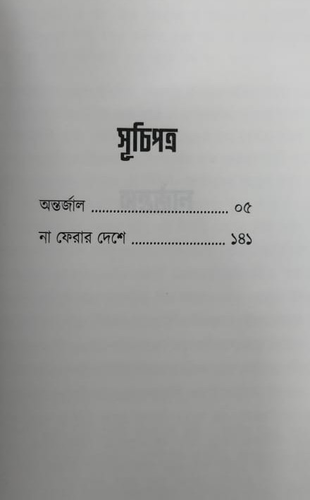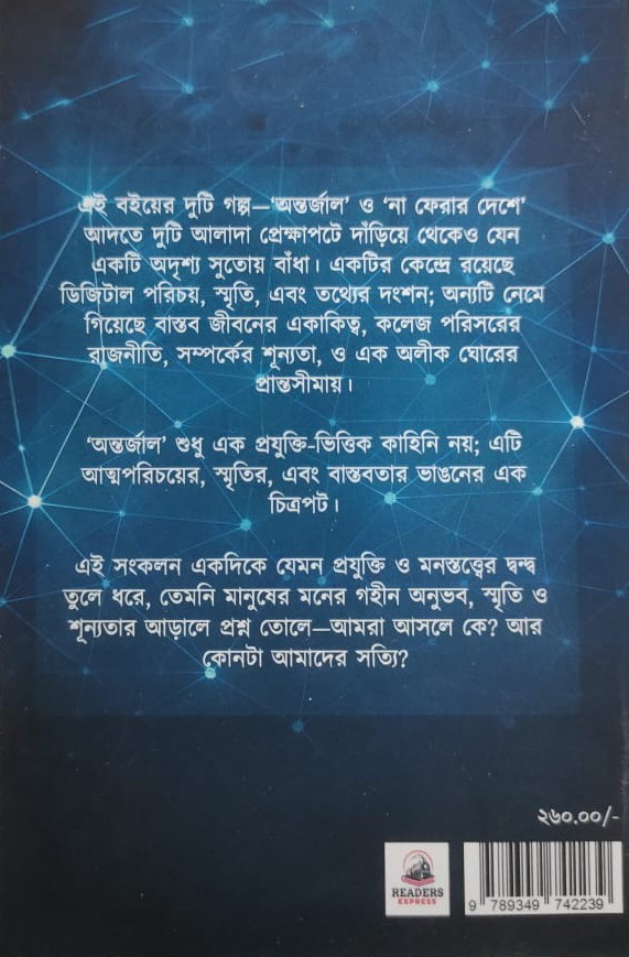 এই বইয়ের দুটি গল্প-'অন্তর্জাল' ও 'না ফেরার দেশে' আদতে দুটি আলাদা প্রেক্ষাপটে দাঁড়িয়ে থেকেও যেন একটি অদৃশ্য সুতোয় বাঁধা। একটির কেন্দ্রে রয়েছে ডিজিটাল পরিচয়, স্মৃতি, এবং তথ্যের দংশন; অন্যটি নেমে গিয়েছে বাস্তব জীবনের একাকিত্ব, কলেজ পরিসরের রাজনীতি, সম্পর্কের শূন্যতা, ও এক অলীক ঘোরের প্রান্তসীমায়।