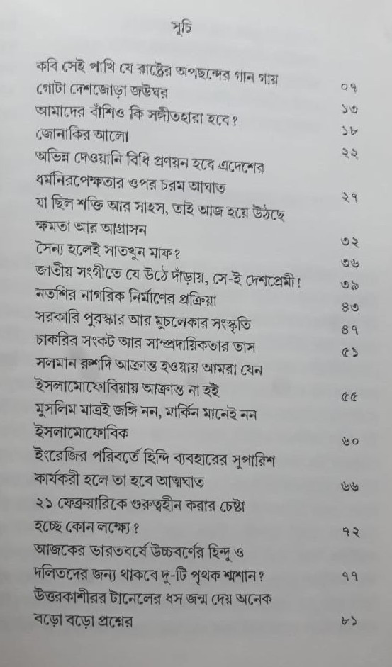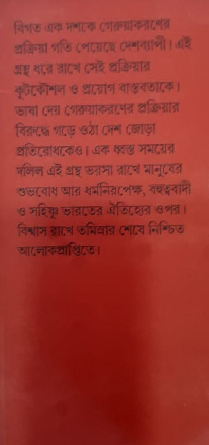 বিগত এক দশকে গেরুয়াকরণের প্রক্রিয়া গতি পেয়েছে দেশব্যাপী। এই গ্রন্থ ধরে রাখে সেই প্রক্রিয়ার কূটকৌশল ও প্রয়োগ বাস্তবতাকে। ভাষা দেয় গেরুয়াকরণের প্রক্রিয়ার বিরুদ্ধে গড়ে ওঠা দেশ জোড়া প্রতিরোধকেও। এক ধ্বস্ত সময়ের দলিল এই গ্রন্থ ভরসা রাখে মানুষের শুভবোধ আর ধর্মনিরপেক্ষ, বহুত্ববাদী ও সহিষ্ণু ভারতের ঐতিহ্যের ওপর। বিশ্বাস রাখে তমিস্রার শেষে নিশ্চিত আলোকপ্রাপ্তিতে।