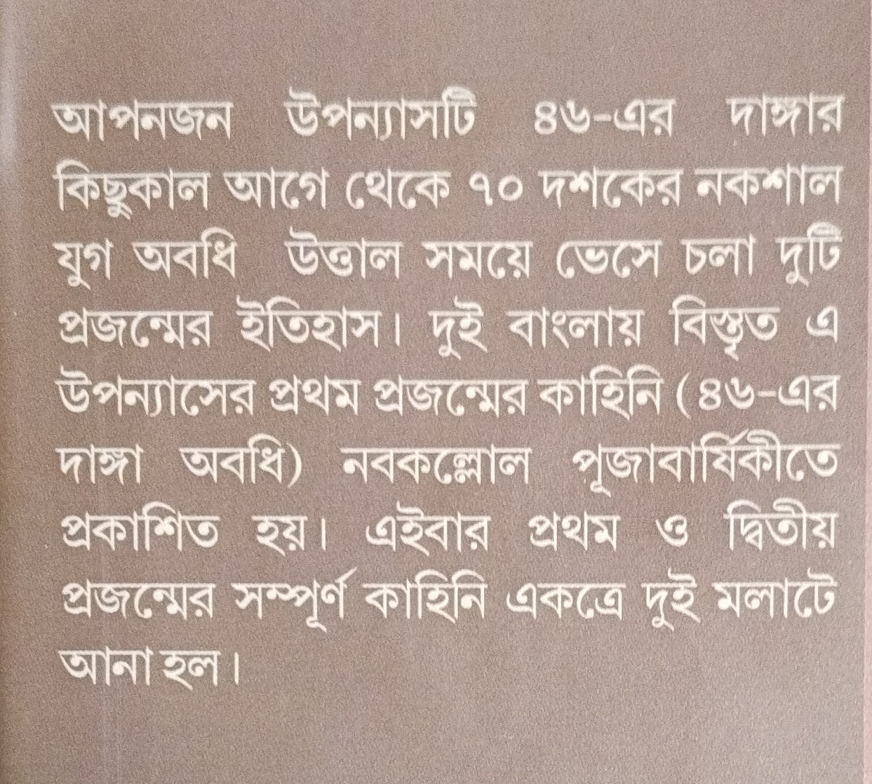 আপনজন উপন্যাসটি ৪৬-এর দাঙ্গার কিছুকাল আগে থেকে সত্তর দশকের নকশাল যুগ অবধি উত্তাল সময়ে ভেসে চলা দুটি প্রজন্মের ইতিহাস। দুই বাংলায় বিস্তৃত এ উপন্যাসের প্রথম প্রজন্মের কাহিনি (৪৬-এর দাঙ্গা অবধি) নবকল্লোল পূজাবার্ষিকীতে প্রকাশিত হয়। এইবার প্রথম ও দ্বিতীয় প্রজন্মের সম্পূর্ণ কাহিনি একত্রে দুই মলাটে আনা হল।