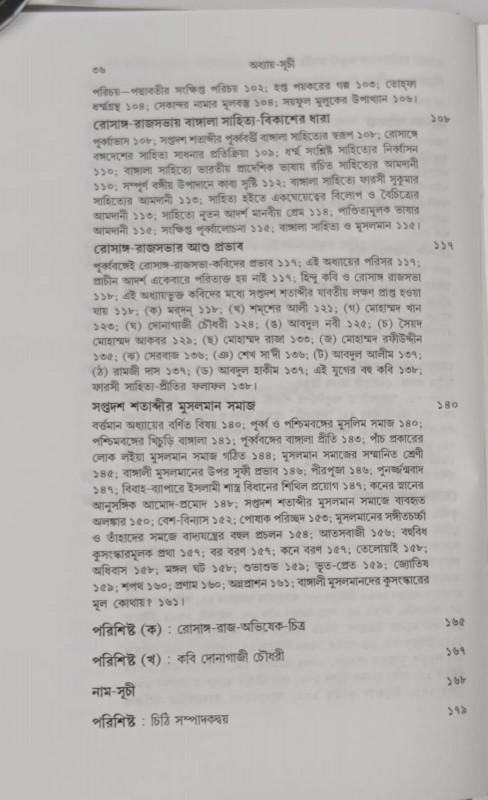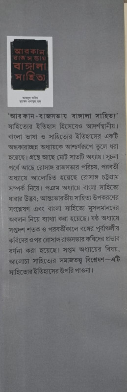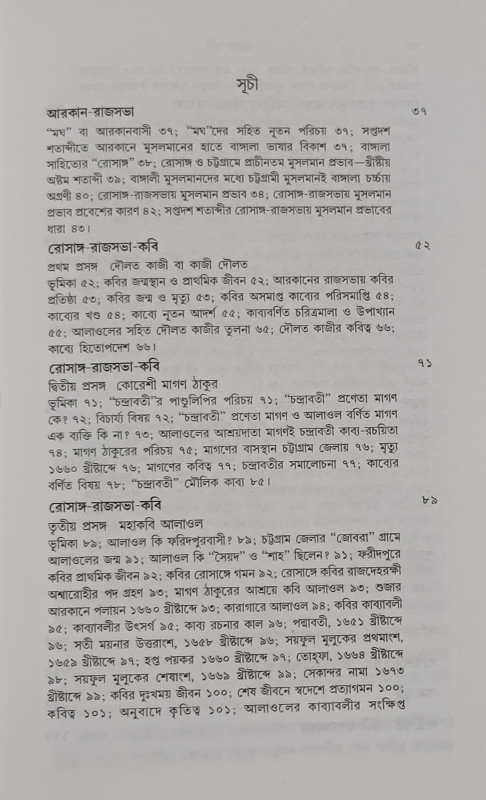 সাহিত্যের ইতিহাস হিসেবেও আদর্শস্থানীয়। বাংলা ভাষা ও সাহিত্যের ইতিহাসের একটি অন্ধকারাচ্ছন্ন অধ্যায়কে আশ্চর্যরূপে তুলে ধরা হয়েছে। গ্রন্থে আছে মোট সাতটি অধ্যায়। সূচনা পর্বে আছে রোসাঙ্গ রাজসভার পরিচয়, পরবর্তী অধ্যায়ে আলোচিত হয়েছে রোসাঙ্গ চট্টগ্রাম সম্পর্ক নিয়ে। পঞম অধ্যায়ে বাংলা সাহিত্যে ধারার উদ্ভব; আন্তঃভারতীয় সাহিত্য উপকরণের সংশ্লেষণ এবং বাংলা সাহিত্যে মুসলমানদের অবদান নিয়ে ব্যাখ্যা করা হয়েছে। ষষ্ঠ অধ্যায়ে সপ্তদশ শতক ও পরবর্তীকালে বঙ্গের পূর্বাঞ্চলীয় কবিদের ওপর রোসাঙ্গ রাজসভার কবিদের প্রভাব বর্ণনা করা হয়েছে। সপ্তম অধ্যায়ের বিষয়, আলোচ্য সাহিত্যের সমাজতত্ত্ব বিশ্লেষণ-এটি সাহিত্যের ইতিহাসের উপরি পাওনা।