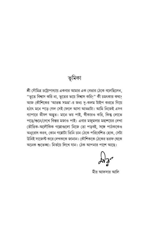 বইয়ের পরতে পরতে লেখক ছুঁয়ে গেছেন অলৌকিক, অপার্থিব, অতিলৌকিক আর ভয়ের চেনা-অচেনা সবকটি বিন্দু, সমস্ত ঘরানা। এই বই তাই গড়পড়তা এক ভয়ের গল্পের সংকলন নয়, বরং এমন এক মানসিক যাত্রা, যেখানে প্রতিটি কাহিনি শেষ হওয়ার পর আতঙ্ক আরও নিবিড় হয়ে পাঠককে ঘিরে ধরে।
