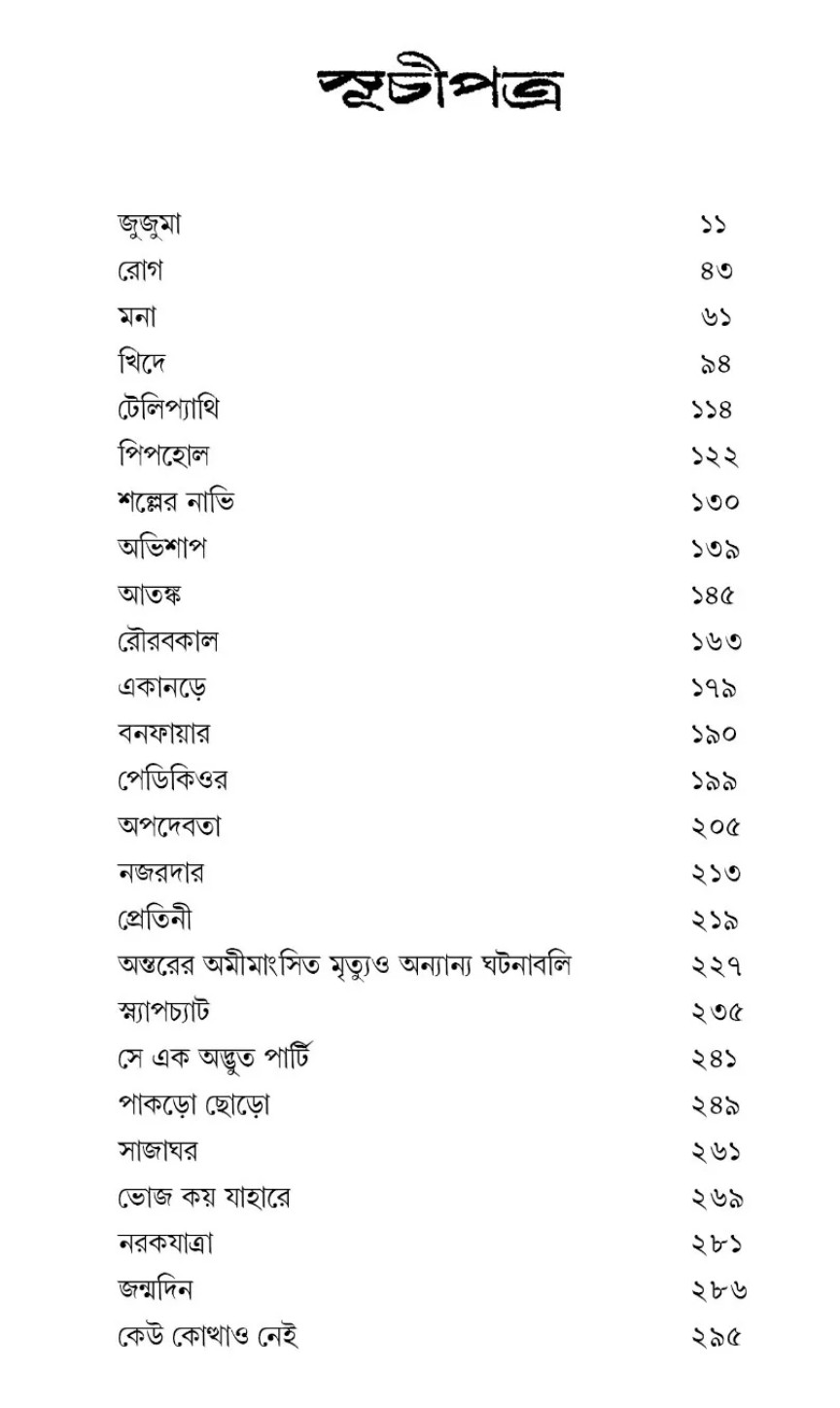 এর পাতায় পাতায় ছড়িয়ে আছে প্রেতাত্মার প্রতিশোধ, সময়ের গর্ভে হারিয়ে যাওয়া এক অভিশপ্ত গ্রামে শল্লের উপদ্রব, মানসিক হাসপাতালে জুজুমার লোকাতীত নারকীয় দৃশ্য আর এমন কিছু দুঃস্বপ্নের কথা, যাদের কেবল রাতেই নয়, দিনের আলোতেও অনুভব করা যায়।