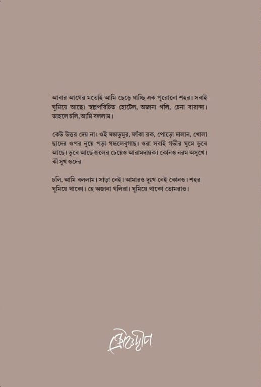 চলি, আমি বললাম। সাড়া নেই। আমারও দুঃখ নেই কোনও। শহর ঘুমিয়ে থাকো। হে অজানা গলিরা। ঘুমিয়ে থাকো তোমরাও।