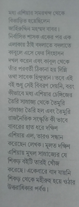 মধ্য এশিয়ার সমরখন্দ থেকে বিতাড়িত হয়েছিলেন জাহিরুদ্দিন মহম্মদ বাবর। নির্বাসিত শাসক একের পর এক এলাকায় ঠাঁই বদলাতে বদলাতে কাবুলে এসে ফের সিংহাসন দখল করেন এবং কাবুল থেকে তাঁর পরবর্তী ঠিকানা হয় দিল্লি তথা সাবেক হিন্দুস্তান। তবে এই বই শুধু সেই বিবরণ দেয়নি, বরং কীভাবে মধ্য এশিয়ার চেঙ্গিজের তৈরি সাম্রাজ্য থেকে তৈমুরি সাম্রাজ্য তৈরি হল এবং তৈমুরি রাজনৈতিক সংস্কৃতি কী ভাবে বাবরের হাত ধরে দক্ষিণ এশিয়ায় এল, তারও সন্ধান করেছেন লেখক। মূলত দক্ষিণ এশিয়ায় মুঘল সাম্রাজ্যের যে শিকড় বইটি তারই খোঁজ করেছে। একেবারে বাদ যায়নি শিকড় থেকে মহীরুহ হয়ে ওঠার উত্তরাধিকার পর্বও।