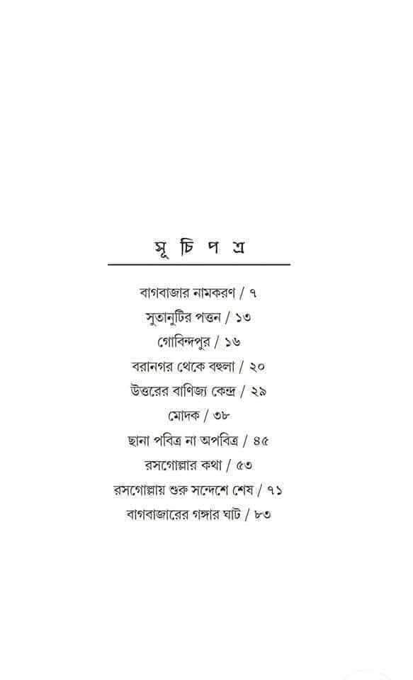 বাগবাজারকে কেন্দ্র করে বাংলা- উড়িষ্যা রসযুদ্ধের কারণে বাগবাজারের নাম মিষ্টান্ন ইতিহাসে সুপরিচিত। গ্রন্থটিতে ১০ টি প্রবন্ধ রয়েছে। বাগবাজারের নামকরণ, সুতানুটির পত্তন, গোবিন্দপুর,বরানগর থেকে বেহুলা, উত্তরের বাণিজ্য কেন্দ্র, মোদক, ছানা পবিত্র না অপবিত্র, রসগোল্লায় শুরু সন্দেশে শেষ, বাগবাজারের গঙ্গার ঘাট।
