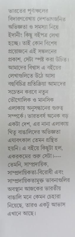 আমাদের বিশ্বাস এ বইয়ের লেখাগুলিতে উঠে আসা বহুবিচিত্র প্রতিক্রিয়া আমাদের সচেতন করবে নতুন ভৌগোলিক ও মানসিক এলাকায় অনুসন্ধানের গুরুত্ব সম্পর্কে। ভারতবর্ষ অনেক বড় একটা দেশ, এর নানা এলাকায় থিতু বাঙালিদের অভিজ্ঞতা এযাবৎকাল তেমন গ্রন্থিত হয়নি। এ বইয়ে কিছুটা হল, একরকমের শুরু সেটা।----তেমনি, সাম্প্রদায়িক, সাম্প্রদায়িকতা-বিরোধী এবং সাম্প্রদায়িকতামুক্ত ভাবনাগুলির অবস্থান আজকের ভারতীয় বাঙালি মনে কেমন চেহারা নিয়েছে, তারও একটু আভাস এখানে আছে।