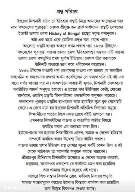 ডা. ফণী পাল অনূদিত ইংরেজিতে লেখা জন ক্লার্ক মার্শম্যানের HISTORY OF BENGAL বইয়ের বঙ্গানুবাদ।মার্সম্যান একজন বহুমুখী প্রতিভার ইংরেজ ঐতিহাসিক ও ধর্মপ্রচারক ও শ্রীরামপুর কলেজের শিক্ষক ছিলেন।ছোটবেলায় বাবা মায়ের হাত ধরে শ্রীরামপুরের আবহাওয়ায় বড় হওয়া। খুব অল্প বয়সে বাংলা ভাষা শিখে নিয়েছিলেন তিনি। শ্রীরামপুর প্রেস থেকে তখন সমাচার দর্পণ প্রকাশিত হত। বর্তমান বইটির বিষয়বস্তু হল ইসলামী শাসন থেকে শুরু করে রাণী ভিক্টোরিয়ার অধীনে বাংলার ইতিহাসকে ধরার চেষ্টা। পরবর্তীকালে ব্যাবসার উদ্দেশ্যে ইউরোপীয়ানদের বাংলায় আগমন হলেও রাজক্ষমতা দখল করাই মূল উদ্দেশ্য হয়ে দাড়ায়।ডঃফণী পালের সুললিত বাংলায় অনুবাদ একটি বিরাট প্রাপ্তি,পড়তে একঘেয়েমী লাগে না।