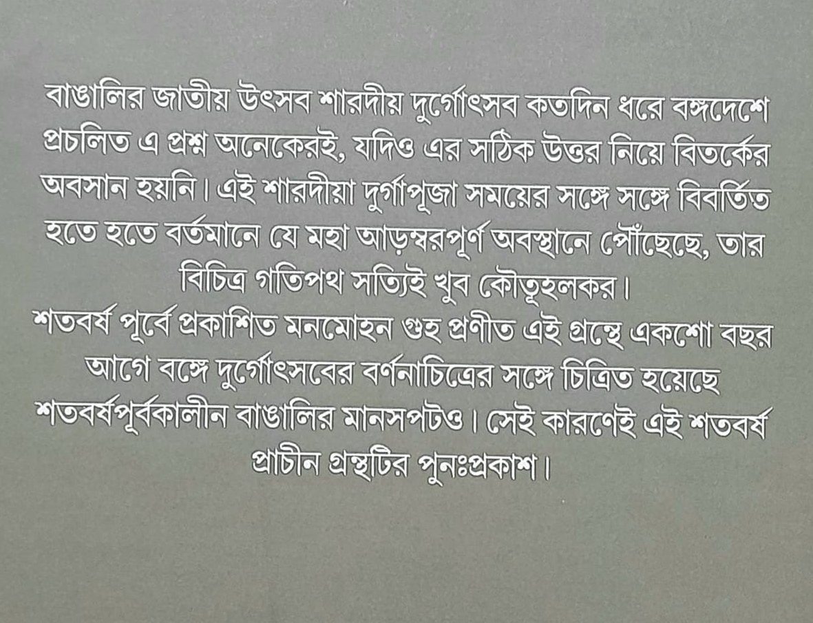 বাঙলার দুর্গোৎসব বিষয়ক প্রাচীন এবং দুষ্প্রাপ্য একটি গ্রন্থ এই বঙ্গে দুর্গোৎসব। মনমোহন গুহ প্রণীত গ্রন্থটি শতবর্ষ পূর্বে প্রকাশিত হয়েছিল। শ্রী গুহ'র মৌলিক দৃষ্টিভঙ্গী, বঙ্গে দুর্গোৎসবের শতবর্ষপূর্বকালীন চিত্র সবিশেষ আকর্ষণীয়।