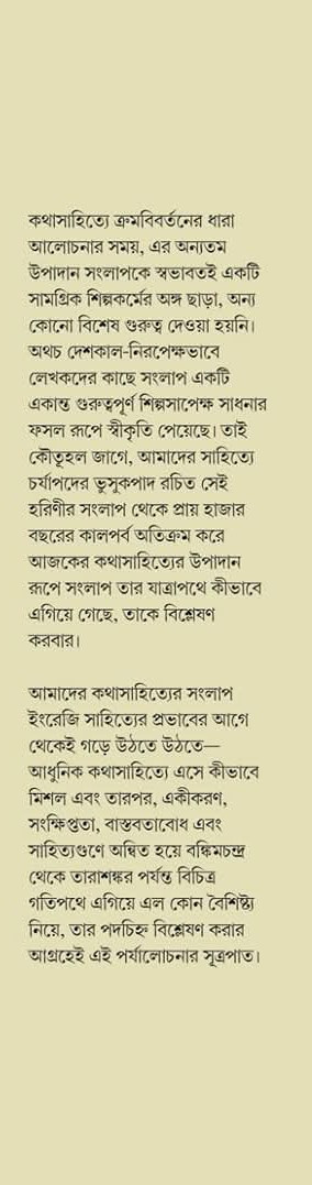 কথাসাহিত্যে ক্রমবিবর্তনের ধারা আলোচনার সময়, এর অন্যতম উপাদান সংলাপকে স্বভাবতই একটি সামগ্রিক শিল্পকর্মের অঙ্গ ছাড়া, অন্য কোনো বিশেষ গুরুত্ব দেওয়া হয়নি। অথচ দেশকাল-নিরপেক্ষভাবে লেখকদের কাছে সংলাপ একটি একান্ত গুরুত্বপূর্ণ শিল্পসাপেক্ষ সাধনার ফসল রূপে স্বীকৃতি পেয়েছে। তাই কৌতূহল জাগে, আমাদের সাহিত্যে চর্যাপদের ভুসুকপাদ রচিত সেই হরিণীর সংলাপ থেকে প্রায় হাজার বছরের কালপর্ব অতিক্রম করে আজকের কথাসাহিত্যের উপাদান রূপে সংলাপ তার যাত্রাপথে কীভাবে এগিয়ে গেছে, তাকে বিশ্লেষণ করবার।