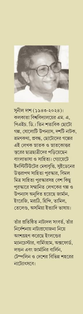 সুনীল দাশ (১৯৪৩-২০২৪) : কলকাতা বিশ্ববিদ্যালয়ের এম, এ, পিএইচ. ডি.। তিন শতাধিক ছোটো গল্প, ষোলোটি উপন্যাস, দশটি নাটক, ভ্রমণকথা, প্রবন্ধ, ছোটোদের গল্পের এই লেখক স্নাতক ও স্নাতকোত্তর স্তরের ছাত্রছাত্রীদের পড়িয়েছেন বাংলাভাষা ও সাহিত্য। গ্যোয়েটে ইনস্টিটিউটের মেধাবৃত্তি, সুইডেনের উত্তরাপথ সাহিত্য পুরস্কার, বিমল মিত্র সাহিত্য পুরস্কারসহ বেশ কিছু পুরস্কারে সম্মানিত লেখকের গল্প ও উপন্যাস অনূদিত হয়েছে জার্মান, ইংরেজি, মরাঠি, হিন্দি, তামিল, তেলেগু, অসমিয়া ইত্যাদি ভাষায়।