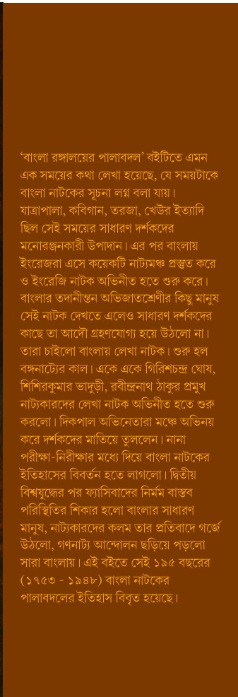 'বাংলা রঙ্গালয়ের পালাবদল' বইটিতে এমন এক সময়ের কথা লেখা হয়েছে, যে সময়টাকে বাংলা নাটকের সূচনা লগ্ন বলা যায়।