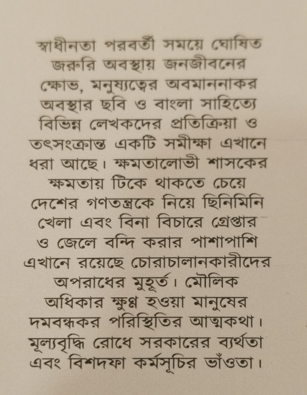 স্বাধীনতা পরবর্তী সময়ে ঘোষিত জরুরি অবস্থায় জনজীবনের ক্ষোভ, মনুষ্যত্বের অবমাননাকর অবস্থার ছবি ও বাংলা সাহিত্যে বিভিন্ন লেখকদের প্রতিক্রিয়া ও তৎসংক্রান্ত একটি সমীক্ষা এখানে আছে। ক্ষমতালোভী শাসকের ক্ষমতায় টিকে থাকতে চেয়ে দেশের গণতন্ত্রকে নিয়ে ছিনিমিনি খেলা এবং বিনা বিচারে গ্রেপ্তার ও জেলে বন্দি করার পাশাপাশি এখানে রয়েছে চোরাচালানকারীদের অপরাধের মুহূর্ত। মৌলিক অধিকার ক্ষুণ্ণ হওয়া মানুষের দমবন্ধকর পরিস্থিতির আত্মকথা। মূল্যবৃদ্ধি রোধে সরকারের ব্যর্থতা এবং বিশদফা কর্মসূচির ভাঁওতা।