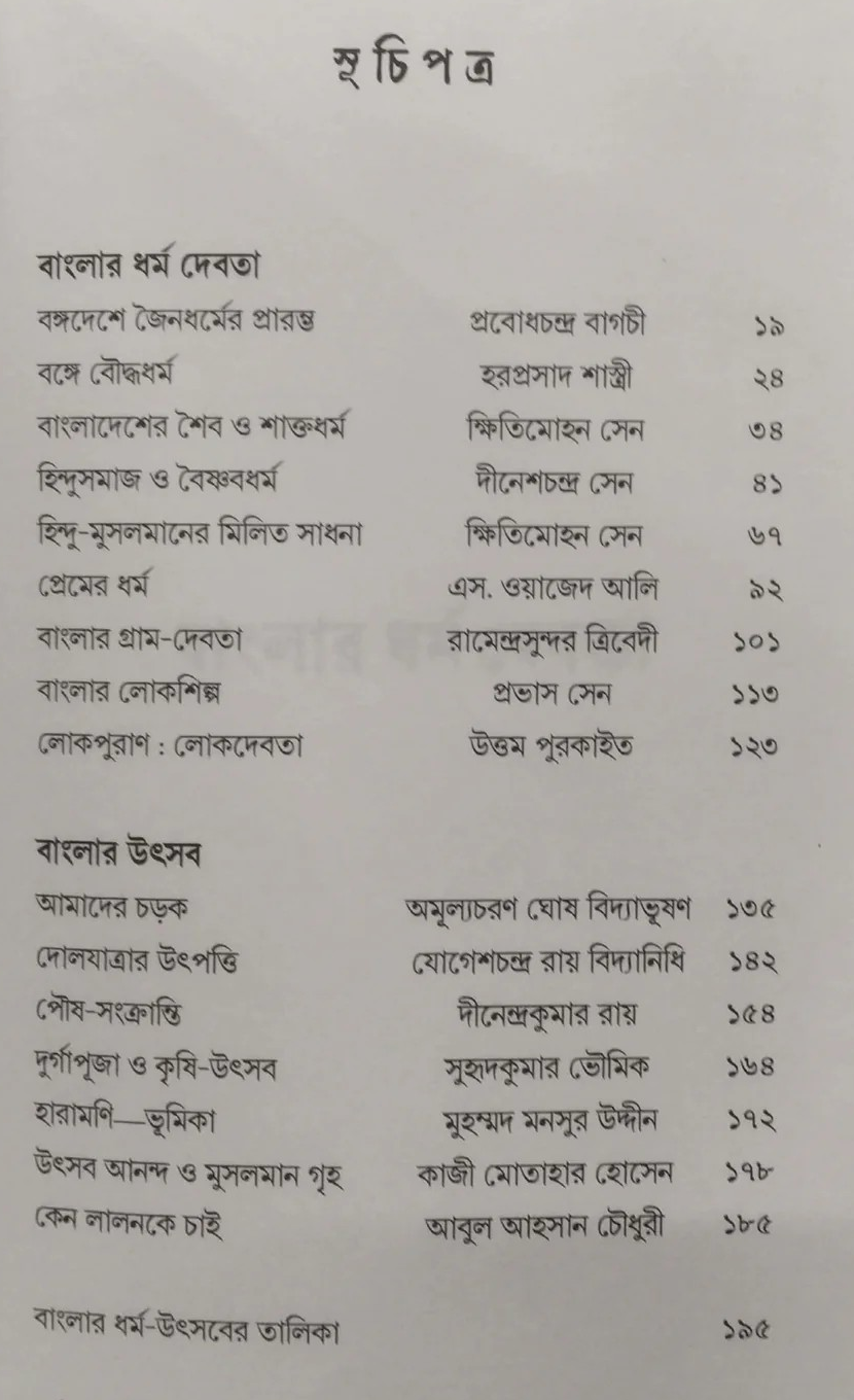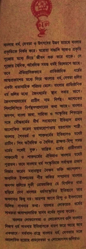 বাংলার ধর্ম, দেবতা ও উৎসবের উদ্ভব হয়েছে বাংলার প্রকৃতিকে নির্ভর করে। ঘরোয়া বাঙালি আজও প্রকৃতি পুজোর মধ্যে দিয়ে জীবন শুরু করে থাকে। সে পুজোয় বৈদিক, অবৈদিক সমস্ত ধর্মই মিলেমশে আছে। তবে ঐতিহাসিকভাবে প্রাতিষ্ঠানিক ধর্মের আত্মপ্রকাশের মধ্যে দিয়ে বাংলার ধর্ম, দেবতা গুলির একটা ধারাবাহিক পরিচয় মেলে। বাংলার প্রাতিষ্ঠানিক ধর্ম গুলির মধ্যে জৈনধর্মের স্থান সবার আগে। জৈনসম্প্রদায়ের প্রাচীন নাম নির্গন্থ। অশোকের শিলালিপিতে নির্ণন্থসম্প্রদায়ের কথা আছে। বাংলার জনপদ, বাংলা ভাষা, সাহিত্য ও সংস্কৃতির শিকড়ের সঙ্গে বৌদ্ধধর্মের দীর্ঘ সংযোগের ইতিহাস প্রথম আলোকিত করেন মহামহোপাধ্যায় হরপ্রসাদ শাস্ত্রী। বাংলায় শৈবধর্ম ও শাক্তধর্মের ইতিহাসও যথেষ্ট প্রাচীন। শিব অবৈদিক ও বৈদিক, ব্রাহ্মণা-হিন্দু সমন্ত ধর্মের সঙ্গেই যুক্ত। তান্ত্রিক ধর্মের প্রাচীনতায় শাক্তদেবী ও শাক্তধর্মের ঐতিহ্যও বাংলায় যথোট পুরাতন। তবে বাংলার ধর্ম সংস্কৃতিতে সর্বাত্মক প্রভাব বিস্তার করেন মহাপ্রভুর বৈষ্ণব ভক্তি আন্দোলন। অন্যদিক ইসলামের পীর ফকির সম্প্রদায় যালোর জনপদ গুলিতে সুফী প্রেমভক্তির যে বিগলিত ধারা ছড়িয়ে দেন বাংলার ধর্মসংস্কৃতির ইতিহাসে তার অবদানও কিছু নয়। তারপর আসে হিন্দু ও ইসলামের মিলিত সাধনার কথা। বাংলার লোকায়ত ধর্মের সাধকরা অসাম্প্রদায়িক মানব ধর্মের সূচনা করেন। বাংলার লোকদেবতা ও লোকোৎসব গুলি বাংলার নিজস্ব ধর্ম সাধনার ইতিহাসকে ধারণ করে আছে আর একভাবে। বর্তমান গ্রন্থে বাংলার ধর্ম, দেবতার সঙ্গে আলোচিত হয়েছে গ্রামদেবভা ও লোকোৎসব গুলিরও।