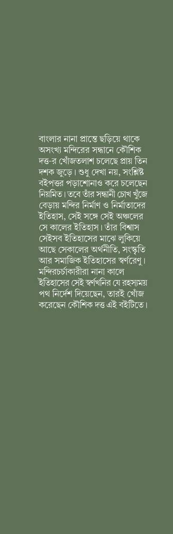 বাংলার নানা প্রান্তে ছড়িয়ে থাকা অসংখ্য মন্দিরের সন্ধানে কৌশিক দত্ত-র খোঁজতলাশ চলছে প্রায় তিন দশক ধরে। শুধু দেখা ন্য। সংশ্লিষ্ট বইপত্র পড়াশোনাও করে চলেছেন নিয়মিত। তাঁর সন্ধানী চোখ খুঁজে বেড়ায় মন্দির নির্মাণ ও নির্মাতাদের ইতিহাস, সেই সঙ্গে সেই অঞ্চলের সেকালের ইতিহাসও। তাঁর বিশ্বাস সেই সব ইতিহাসের মধ্যে লুকিয়ে আছে সেকালের অর্থনীতি, সংস্কৃতি আর সামাজিক ইতিহাসের স্বর্ণরেণু। মন্দিরচর্চাকারীরা নানা কালে ইতিহাসের সেই সোনার খনির যে রহস্যময় পথ-নির্দেশ দিয়েছেন, তারই খোঁজ করেছেন লেখক এই বইটিতে।