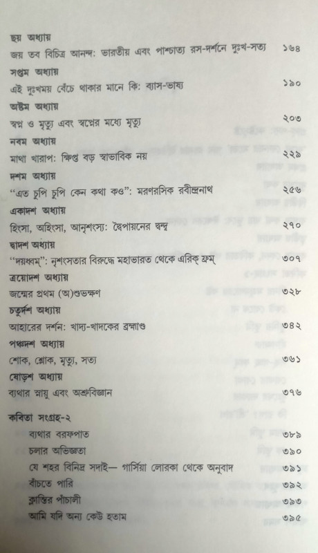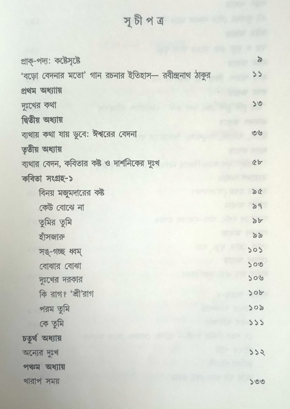 যে অনুভূতিটা হওয়ামাত্রই মনে হয় এটা চলে যাক- সেই প্রতিকূলবেদনীয় যাতনাকেই বলে দুঃখ। এই 'যাতনা কাহারে বলে', তা নিয়েই স-তর্ক ধ্যান করা হল এই বইয়ে। ব্যথা যেমন আমাদের 'লাগে'- তেমন অনেক সহৃদয়ের টান-টান হৃদয়তারে সেতারের অনেক স্বরে গড়ানো মীড়ের মতন 'বেজে ওঠে' আমাদের অস্ফুট স্মৃতিমেদুর বেদনা। বাল্মীকি থেকে শক্তি চট্টোপাধ্যায় পর্যন্ত কবিরা তাই কষ্ট নিয়ে কবিতা লিখে আমাদের প্রাণ শূন্য করে ভরিয়েছেন। খারাপ-ভালোর অতীত সেই আর্তির নাদ থেকেই সৃষ্টি হয়েছে রবীন্দ্রনাথের প্রাণ-নিংড়ানো যোগিয়া-কালাংড়ার গান- 'বড়ো বেদনার মতো, বেজেছ'।