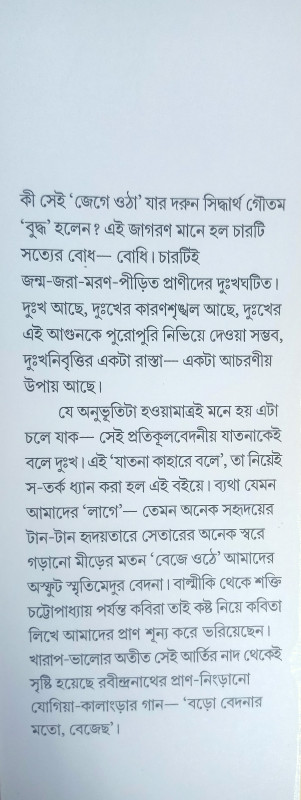 কী সেই 'জেগে ওঠা' যার দরুন সিদ্ধার্থ গৌতম 'বুদ্ধ' হলেন? এই জাগরণ মানে হল চারটি সত্যের বোধ- বোধি। চারটিই জন্ম-জরা-মরণ-পীড়িত প্রাণীদের দুঃখঘটিত। দুঃখ আছে, দুঃখের কারণশৃঙ্খল আছে, দুঃখের এই আগুনকে পুরোপুরি নিভিয়ে দেওয়া সম্ভব, দুঃখনিবৃত্তির একটা রাস্তা- একটা আচরণীয় উপায় আছে।