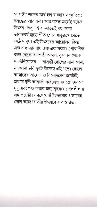 'বাসন্তী' শব্দের অর্থ হল বাংলার সংস্কৃতিতে বসন্তের আরাধনা। আর বসন্ত মানেই রঙের উৎসব। শুধু এই বাংলাতেই নয়, সারা ভারতবর্ষ জুড়ে শীত শেষে ঋতুরঙ্গে মেতে ওঠে মানুষ। এই উৎসবের আয়োজন কিন্তু এক এক জায়গায় এক এক রকম। পৌরাণিক কাল থেকে বাদশাহী আমল, বৃন্দাবন থেকে শান্তিনিকেতন- বাসন্তী দোলের নানা জানা, না-জানা ছবি ফুটে উঠেছে এই গ্রন্থে। দোলে আমাদের আমোদ ও বিনোদনের রূপটিই প্রথমে দৃষ্টি আকর্ষণ করলেও বসন্তোৎসবকে মৃদু এবং ঋদ্ধ করার জন্য কৃষ্ণের দোললীলার এই প্রচেষ্টা। সবশেষে শ্রীচৈতন্যের প্রভাবেই দোল আজ জাতীয় উৎসবে রূপান্তরিত।