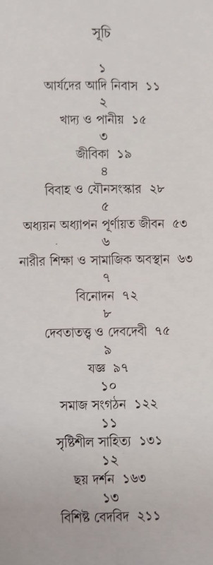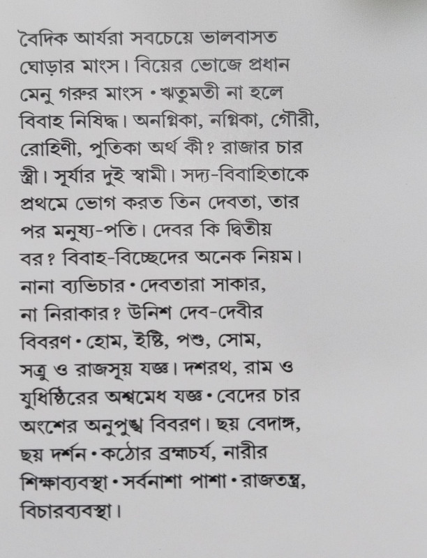 বৈদিক আর্যরা সবচেয়ে ভালবাসত ঘোড়ার মাংস। বিয়ের ভোজে প্রধান মেনু গরুর মাংস ঋতুমতী না হলে বিবাহ নিষিদ্ধ। অনগ্নিকা, নগ্নিকা, গৌরী, রোহিণী, পুতিকা অর্থ কী? রাজার চার স্ত্রী। সূর্যার দুই স্বামী। সদ্য-বিবাহিতাকে প্রথমে ভোগ করত তিন দেবতা, তার পর মনুষ্য-পতি। দেবর কি দ্বিতীয় বর? বিবাহ-বিচ্ছেদের অনেক নিয়ম। নানা ব্যভিচার দেবতারা সাকার, না নিরাকার? উনিশ দেব-দেবীর বিবরণ হোম, ইষ্টি, পশু, সোম, সত্রু ও রাজসূয় যজ্ঞ। দশরথ, রাম ও যুধিষ্ঠিরের অশ্বমেধ যজ্ঞ বেদের চার অংশের অনুপুঙ্খ বিবরণ। ছয় বেদাঙ্গ, ছয় দর্শন কঠোর ব্রহ্মচর্য, নারীর শিক্ষাব্যবস্থা সর্বনাশা পাশা রাজতন্ত্র, বিচারব্যবস্থা।